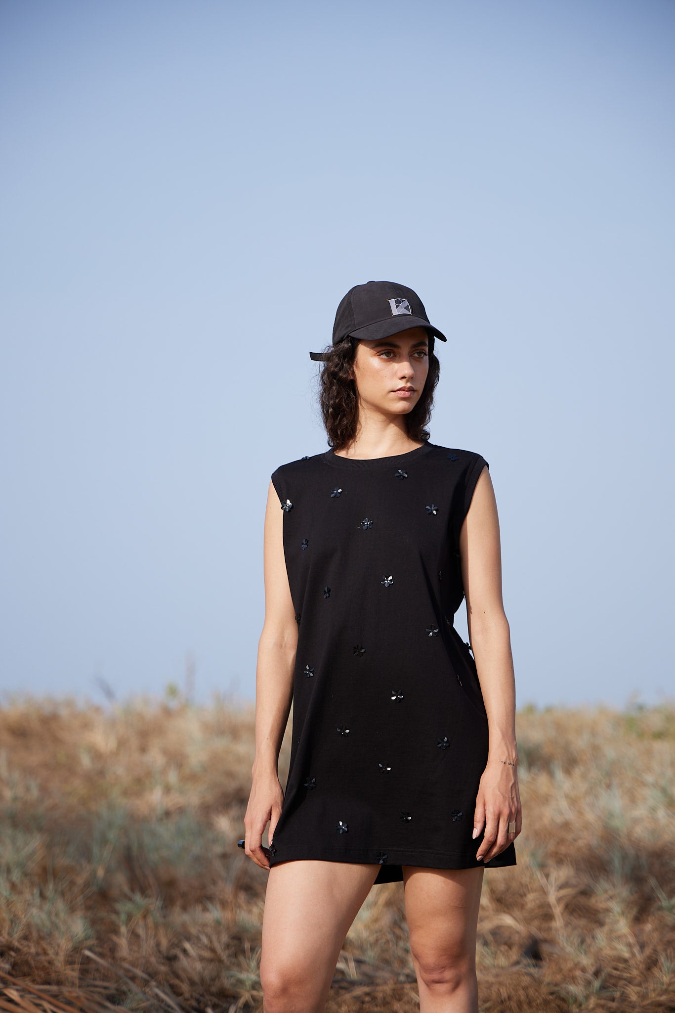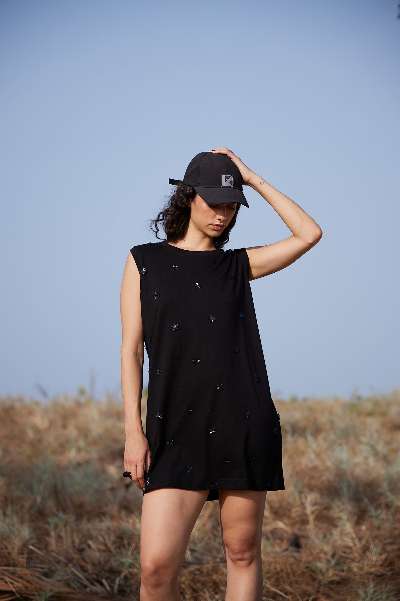 Another versatile piece rises to every occasion from our AntiThesis collection! The Black Knit T-shirt Dress blossoms with flower sequin embroidery all over. Meanwhile, the neck and armhole are classily ribbed. The best part and the part you’ll look forward to most upon receiving this dress? It comes with and without sleeves!