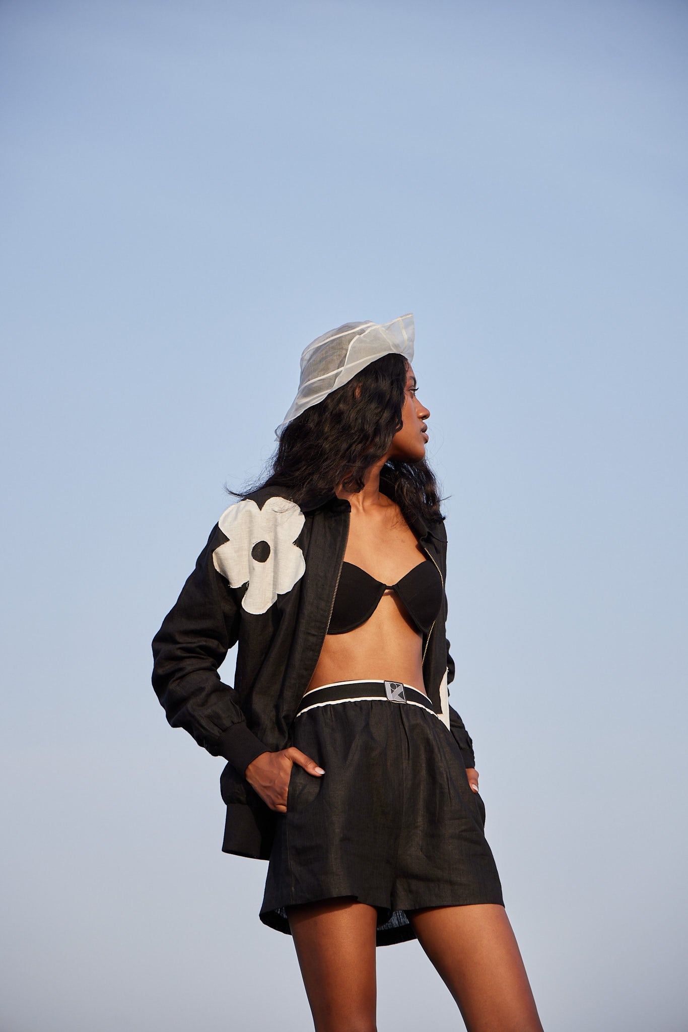 Our Black Linen Shorts from the AntiThesis collection combine easy-breeziness and elegance effortlessly. They’re the pinnacle of versatility, featuring two side pockets, a black and white elasticated waist belt. These women’s shorts not only belong in your holiday suitcase but also hold the potential to become a wardrobe staple while putting together cute and casual summer outfits.