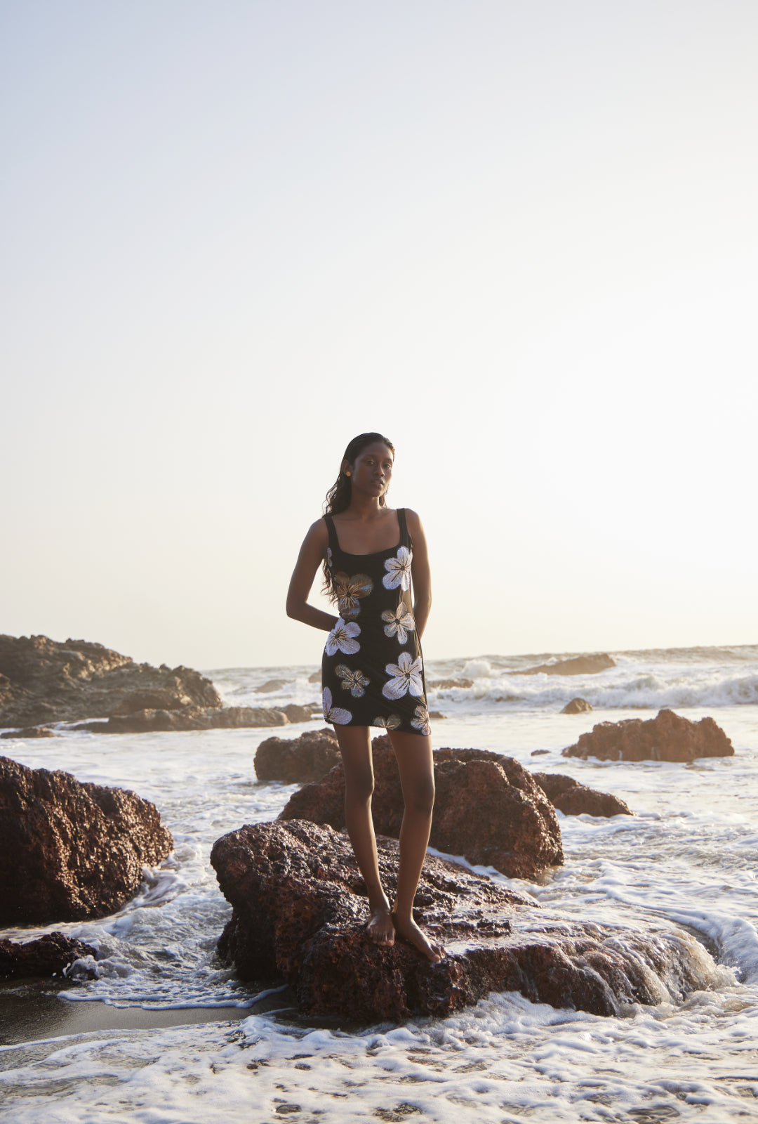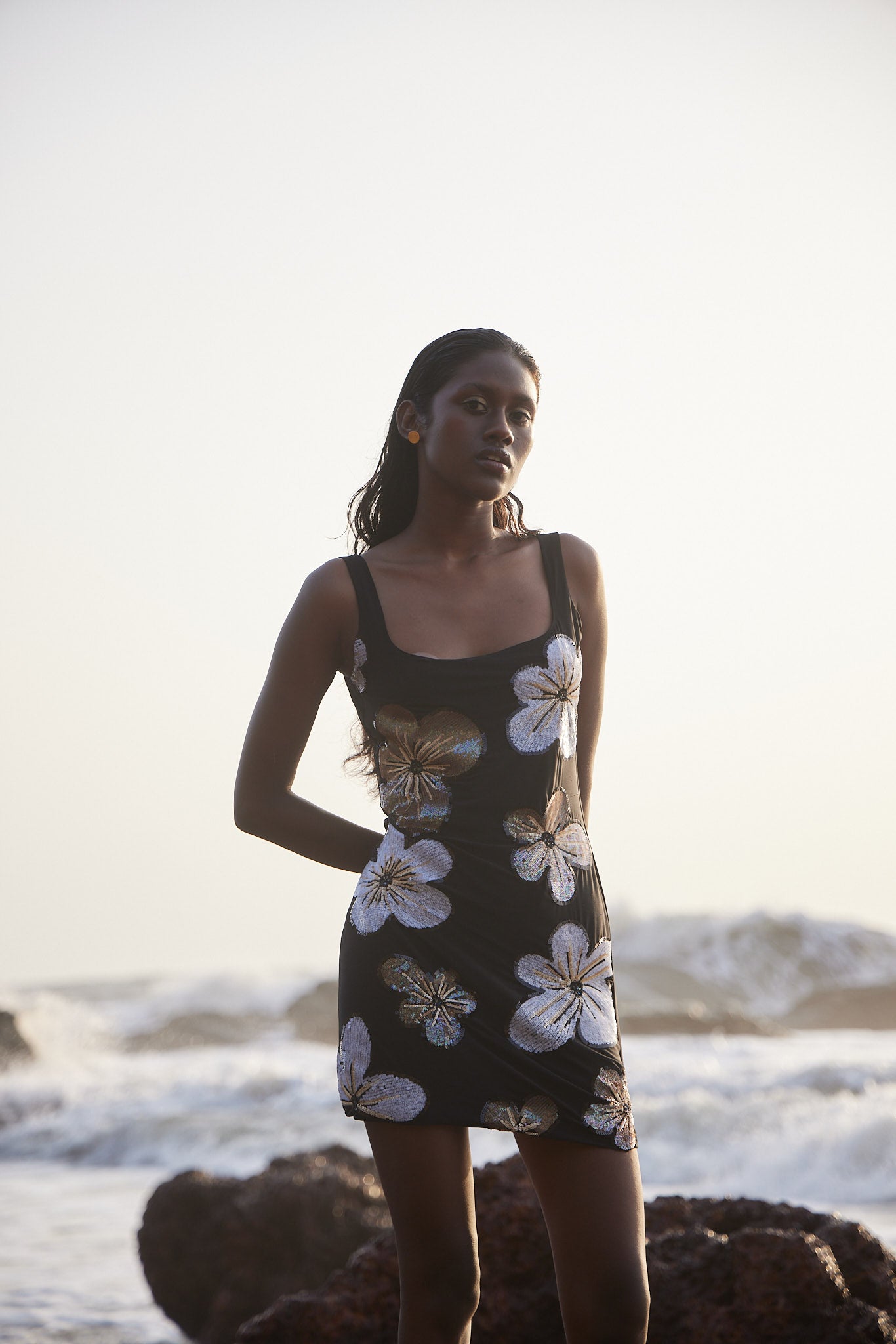 Step into elegance with this stunning black mini dress, crafted from high-quality Lycra and adorned with intricate sequin and bead embroidery. The sleek, body-hugging silhouette features a flattering scoop neckline and delicate shoulder straps, perfectly showcasing your curves. The shimmering floral appliqués add a touch of glamour and sophistication, making this dress ideal for beach parties or evening events. The combination of Lycra's comfort and the dazzling embellishments ensures you'll be the center of attention wherever you go.