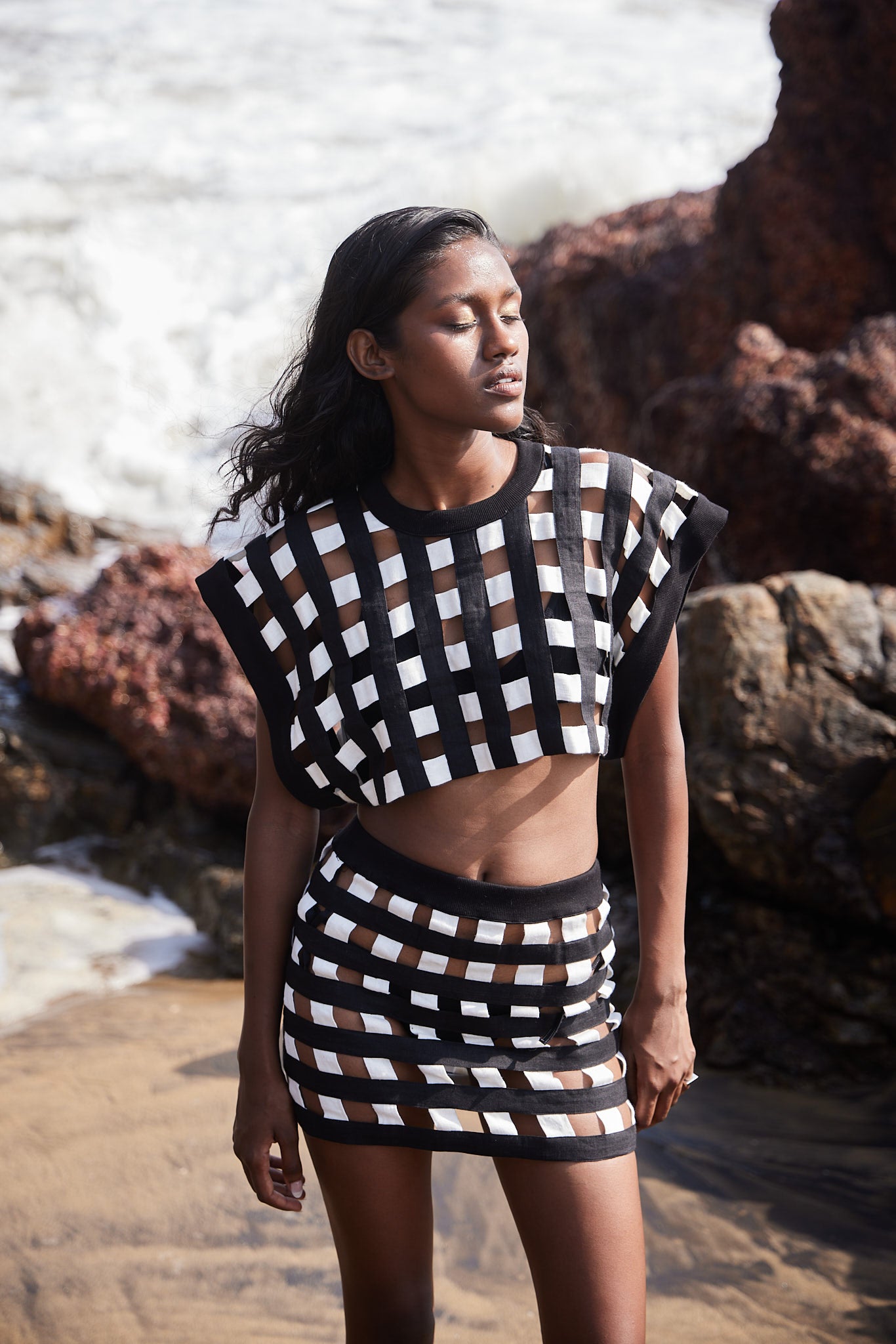 Experience a one-of-a-kind sartorial shift in our Black & White Linen Checkered Top. The oversized crop top has a black rib round neck and big armhole cut sleeves. The black and white stripes are both timeless and trendy. You’ll have the time of your life styling this women’s top, that’s for sure!