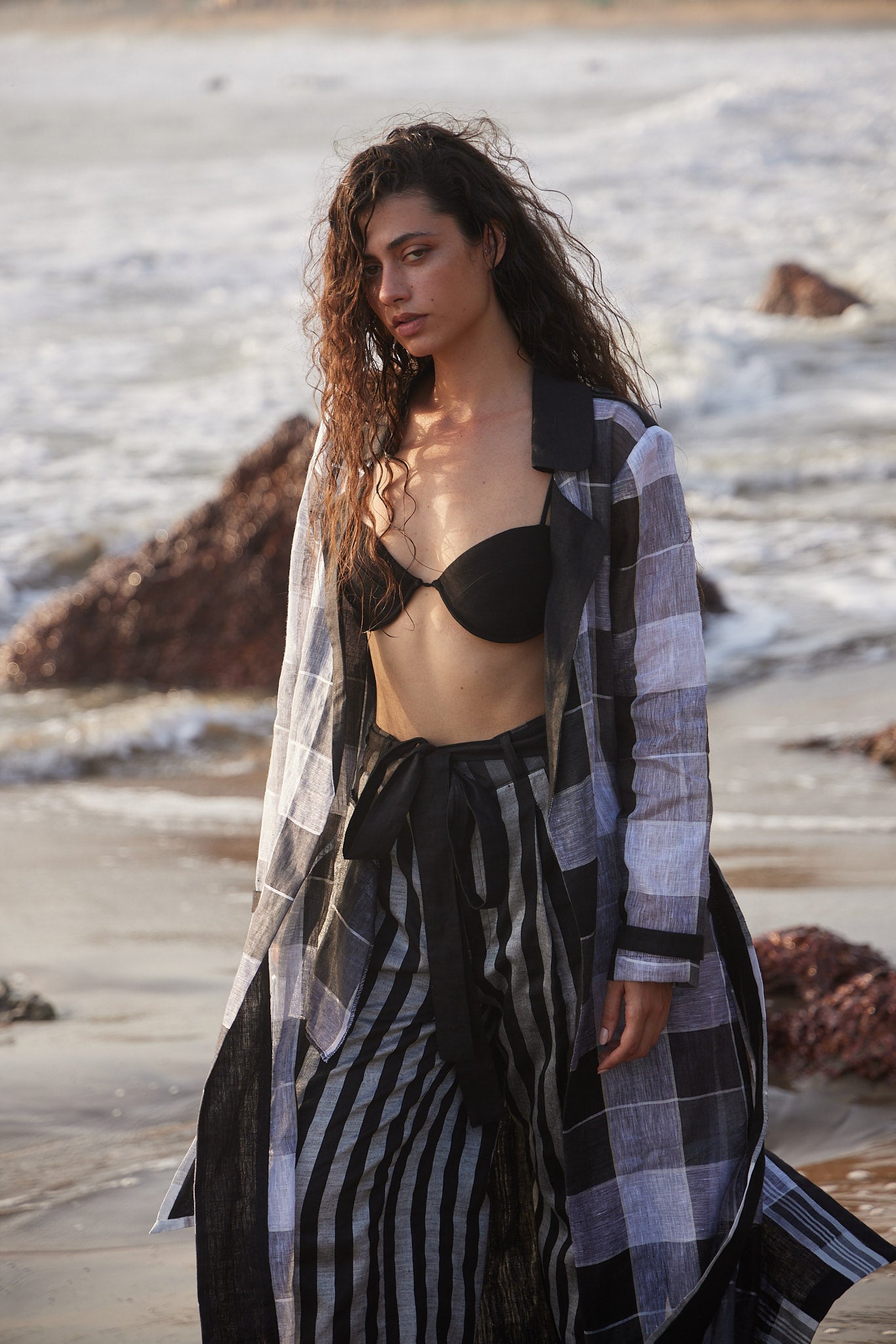 The Check Long Linen Trench Overlay is the third variation of overlays from our AntiThesis collection and we bet you’ll love the print-on-print action, for a change! The black lapel collar as well as the epaulette shoulder details would make any fashionista want to adorn it the second they gaze at it. The horizontal stitch lines on the back yoke as well as the vertical stripes at the back make it an unforgettable separate in your vacation wardrobe. It also comes with a detachable black waist belt, for convenience and style quotient.