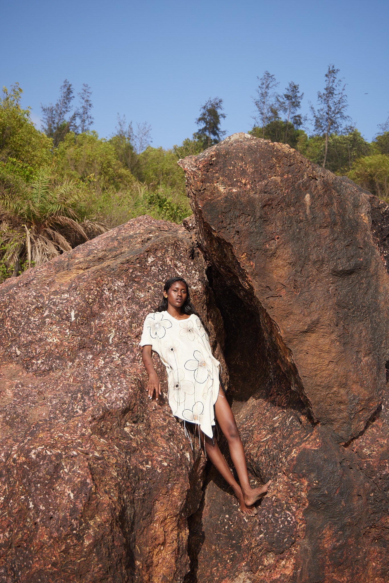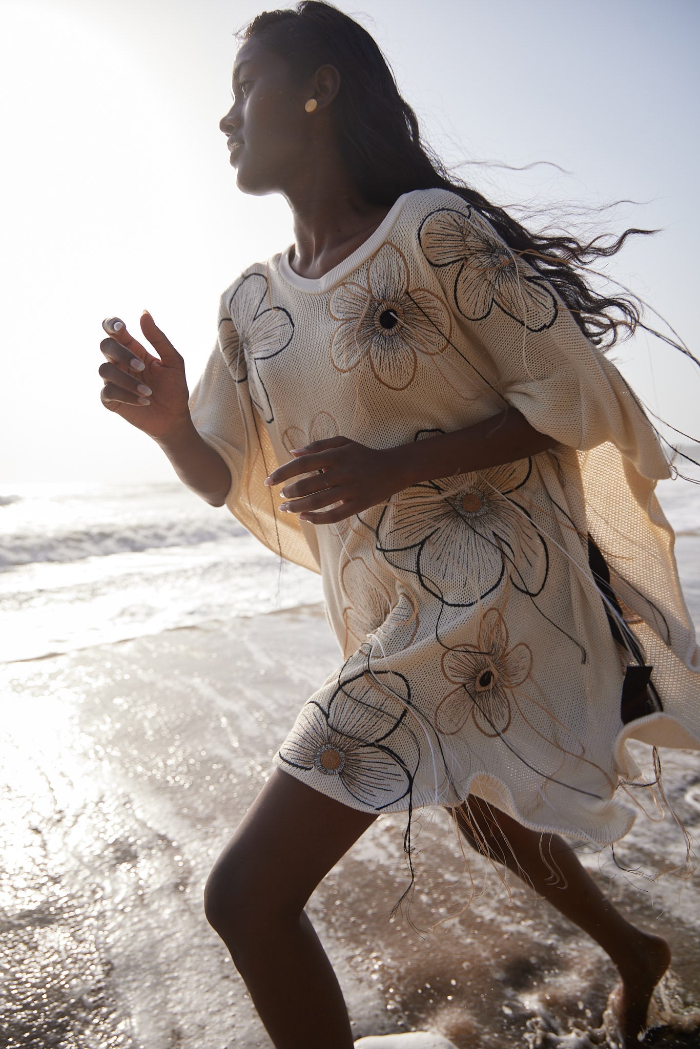 Calling all the beach enthusiasts! Our Crochet Embroidered Short Cover-up is your ultimate ally for stylish runs along the shore. With a beige rib round neck, poppy flowers placed thoughtfully with thread hangings all over and a side tie-up with a black linen long stitched belt, this add-on foretells the stories of laid-back high fashion effortlessly.