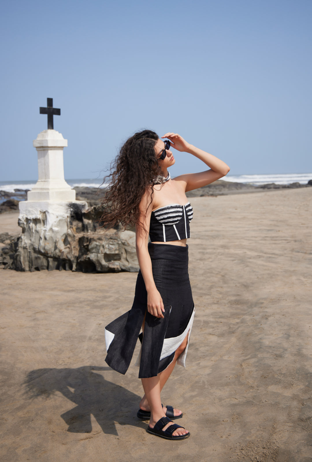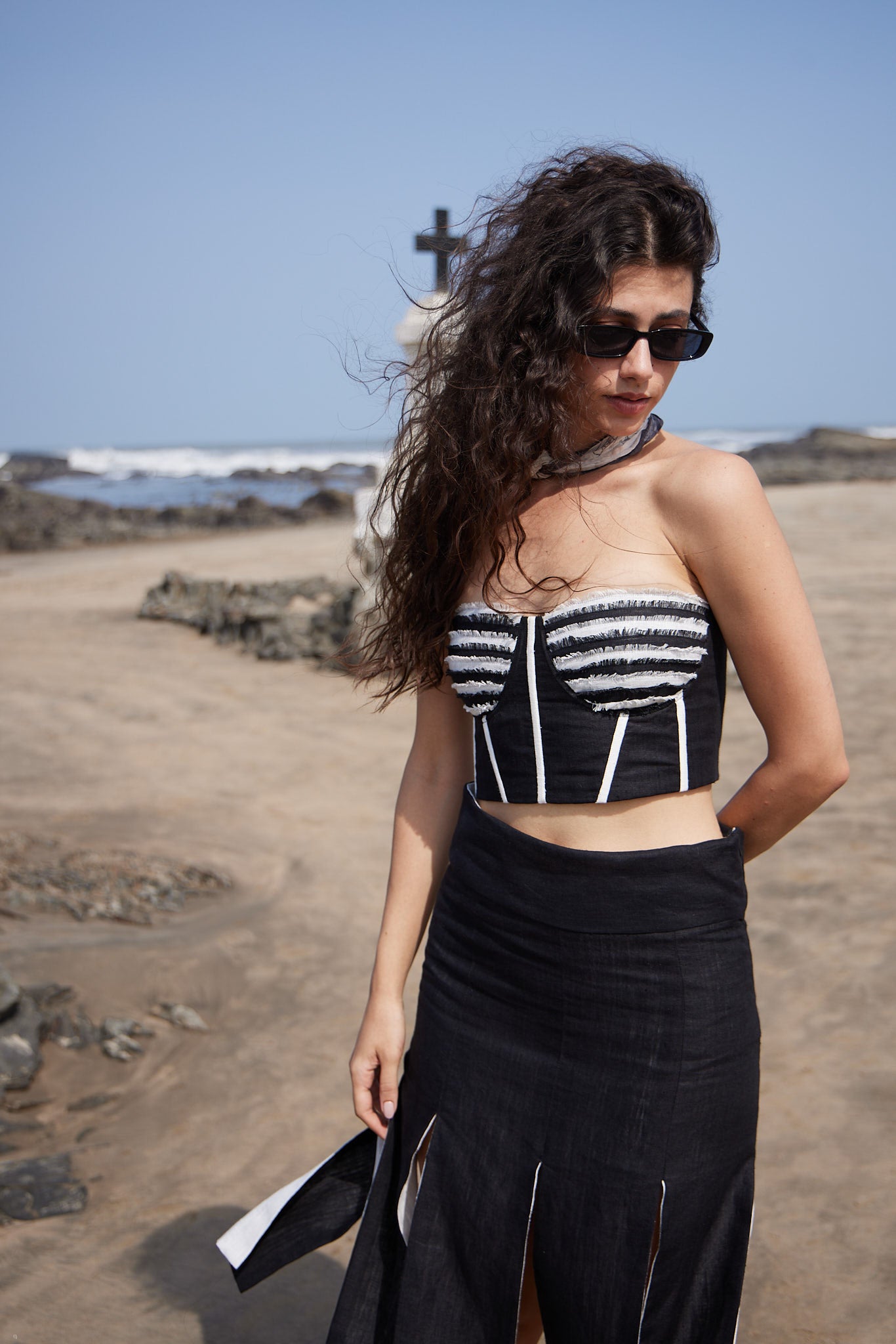 If you’ve been on the lookout for the most statement-etching corset for your holiday and beyond, stop searching. Our White & Black Contrast Corset has come to save the day. The fringe detailing of linen fabric on the bust and a boned bodice highlighted with white linen stripes makes it a super casual yet chic addition to your summer closet. Layer it without abandon, with white or black pants for a groovy look.