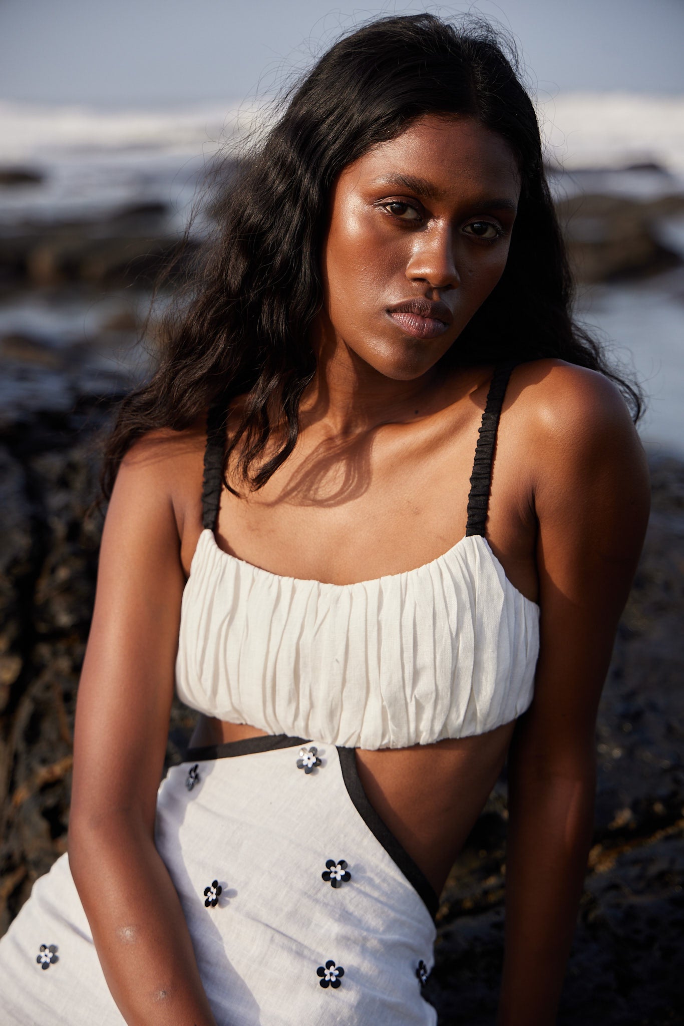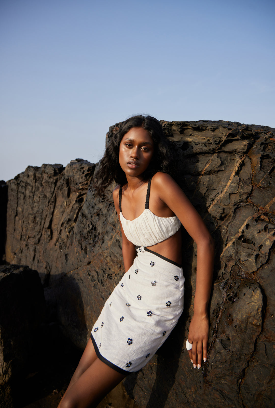 Prepare to be dazzled and rejuvenated at the same time when you adorn our White & Black Linen Short Dress. With its inventive waist cut design and the gathered top bustier with black elasticated straps. What completes the top elegantly is the skirt, embellished with black and white flower cut sequins and beads. An unexpected detail is the black linen fabric, making the dress look whole and wholesome. For the wearer’s peace of mind, the dress is finished with cotton mul lining and a zip fastening at the back of the dress.