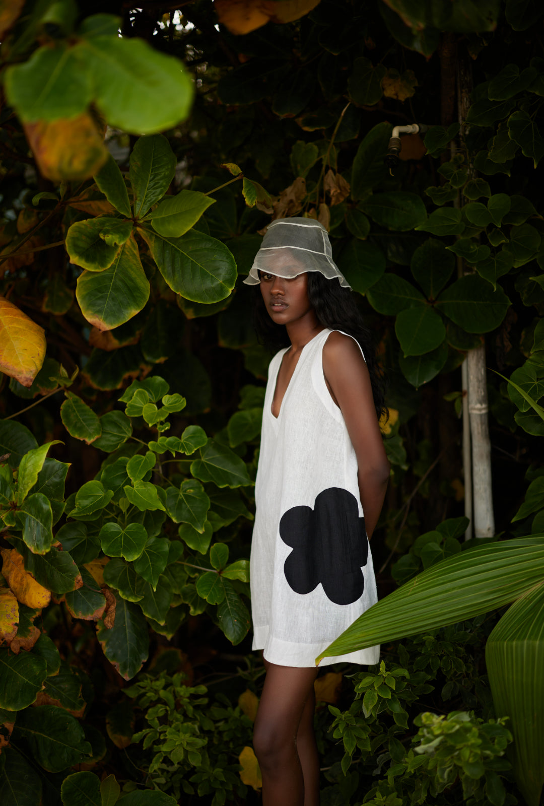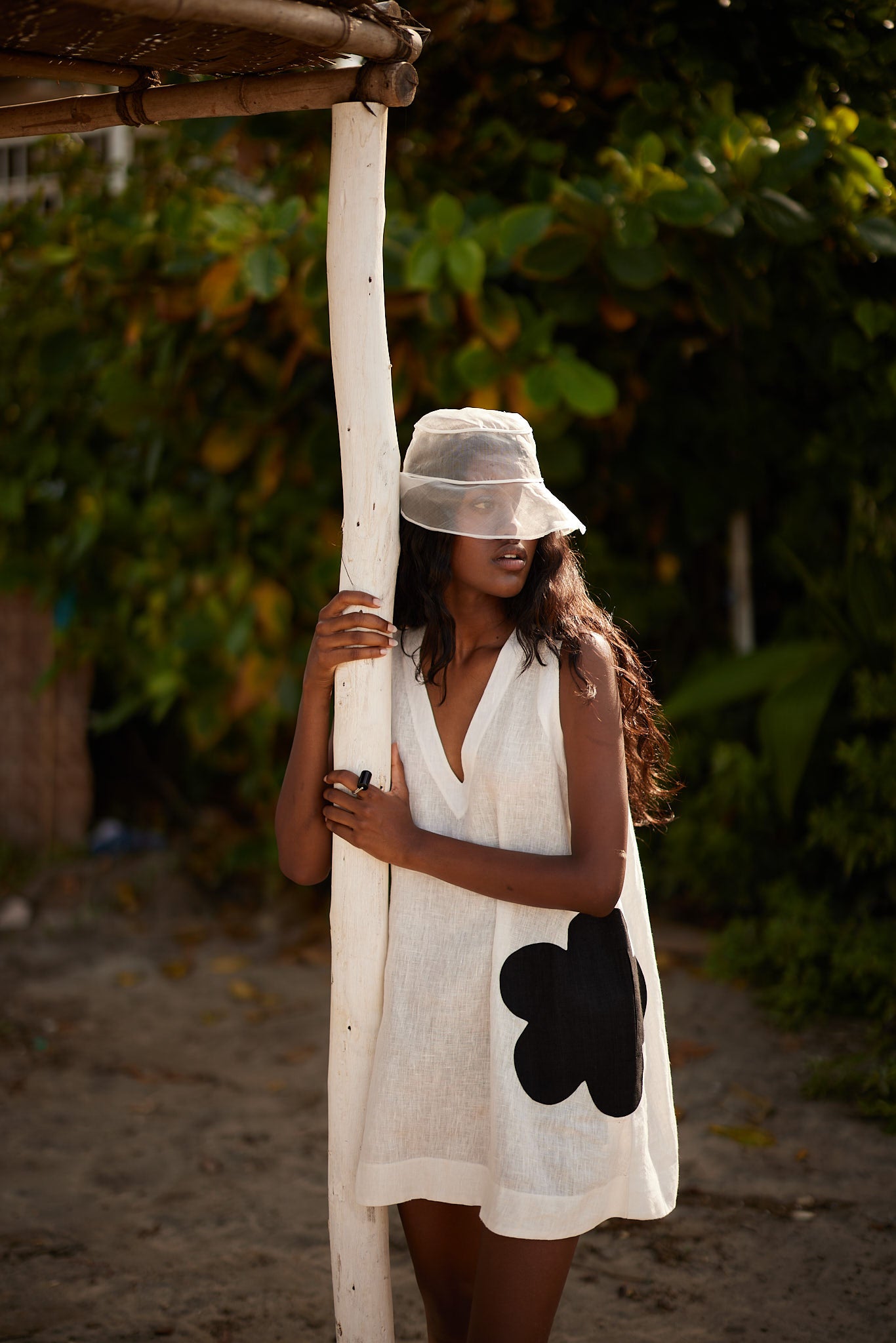 Cash in on the essence of travel with the concept of dopamine dressing in the form of our White Linen A-line Loose-fit Dress! This sleeveless, V-neckline one-piece blooms to life with the poppy flower motif in black linen patched on one side with a concealed pocket. Pair it with your favourite sneakers to dress it down or black, chunky wedges to dress it up.