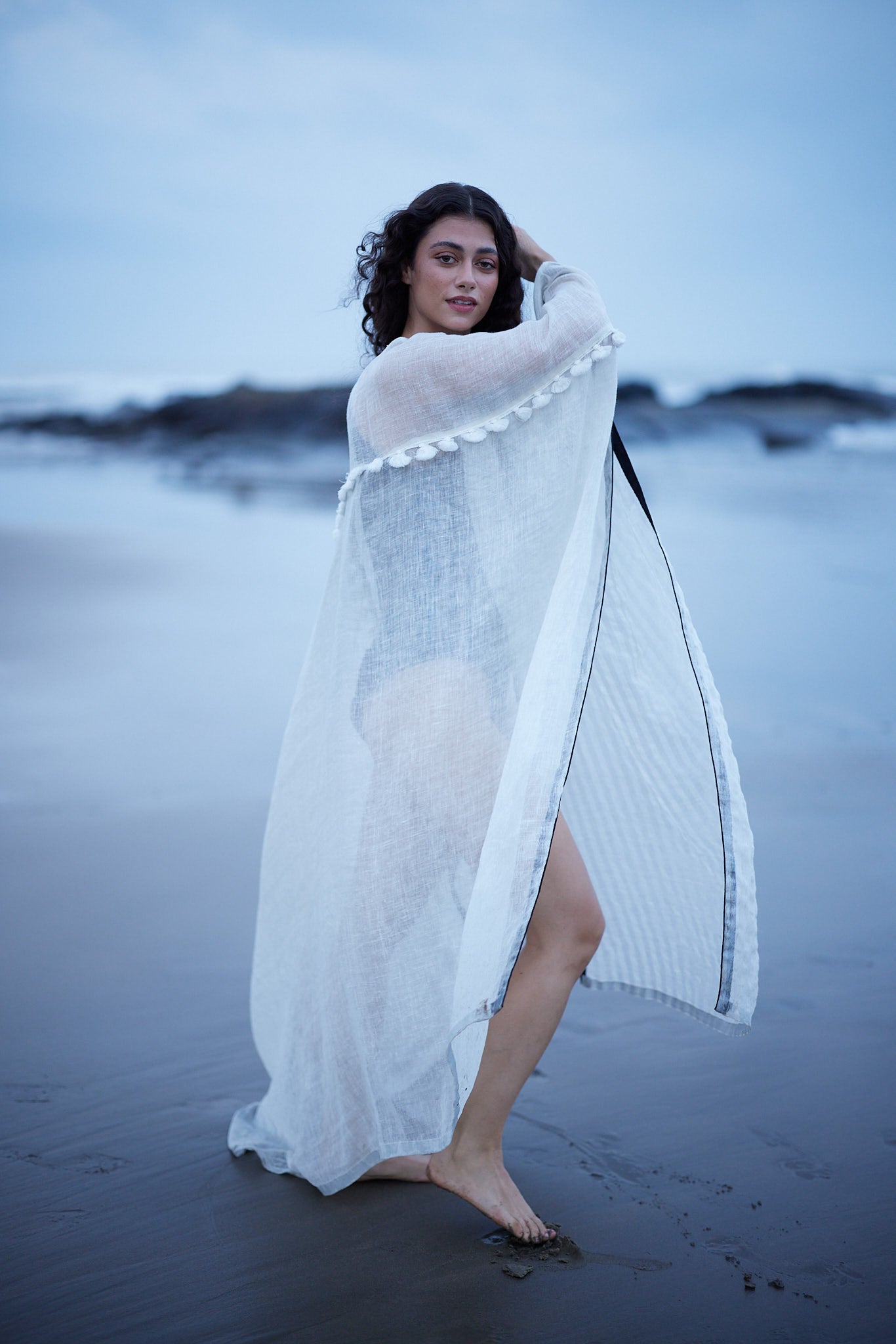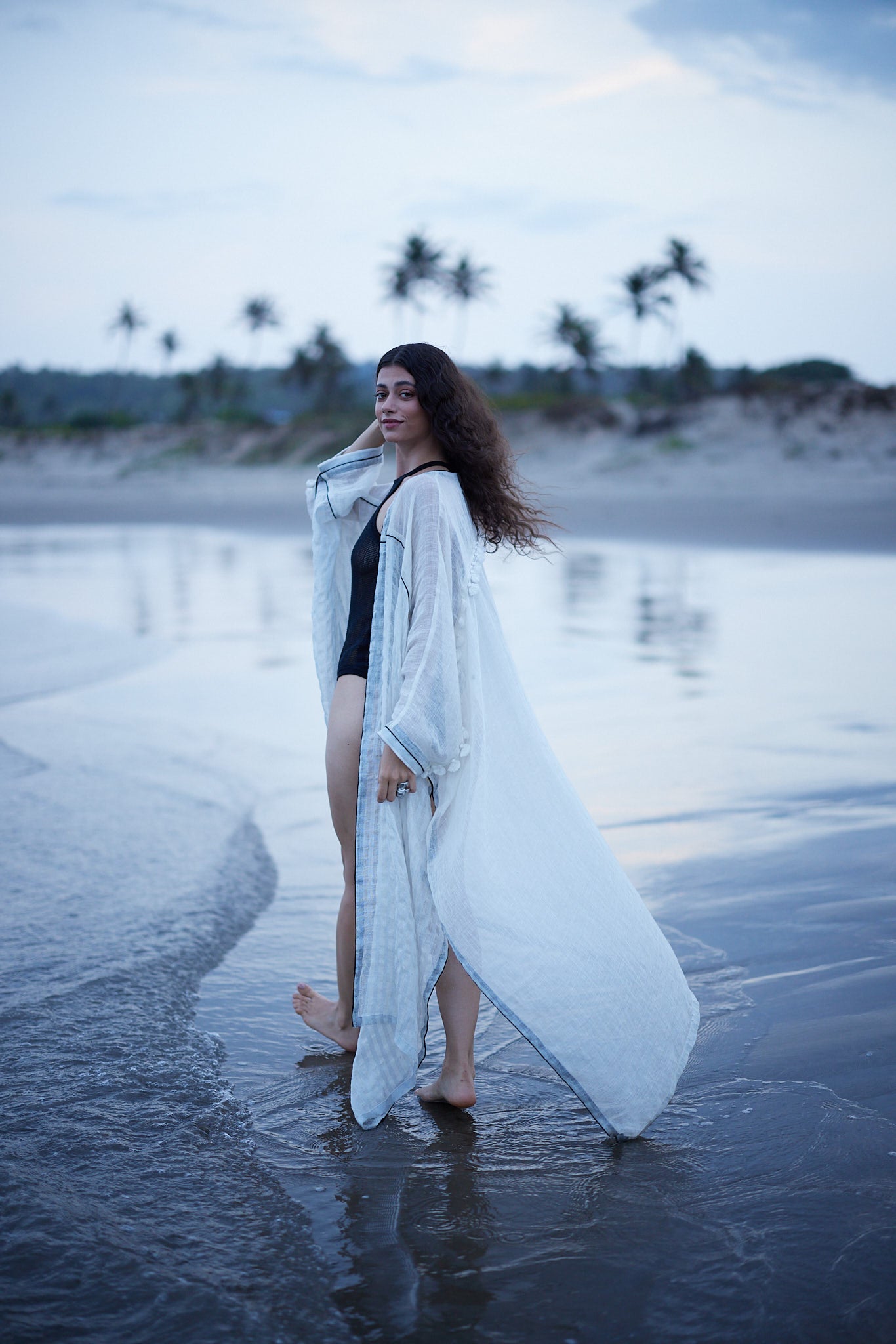 This White Linen Kaftan is a sartorial reminder to breathe in the ocean air and reconnect with your inner self. The next time you find yourself away from the hustle-bustle of your life, we recommend cladding yourself in this full-length Kaftan which has a vertical self striped design and finished with black linen stripes on the chest. The back yoke has been highlighted with white tassels for a splash of whimsical. It is known to go superbly well with your best black bikini set.