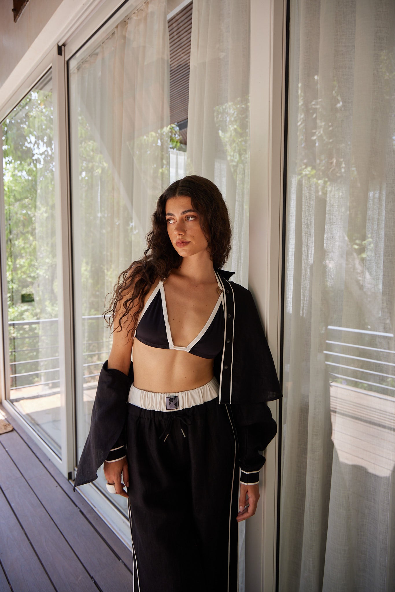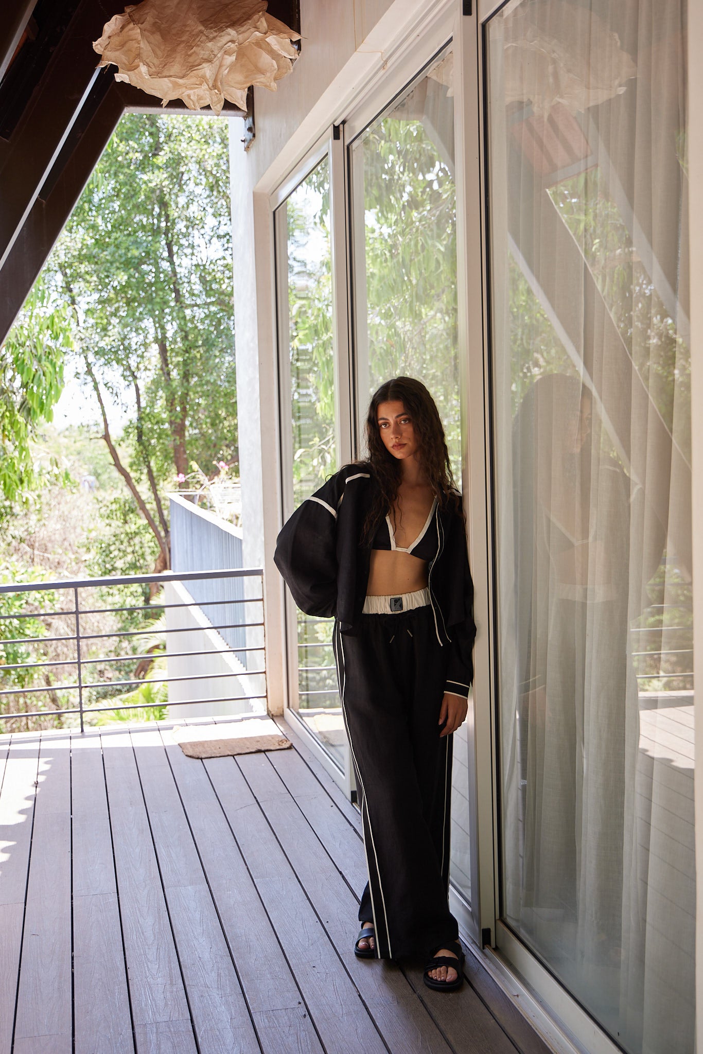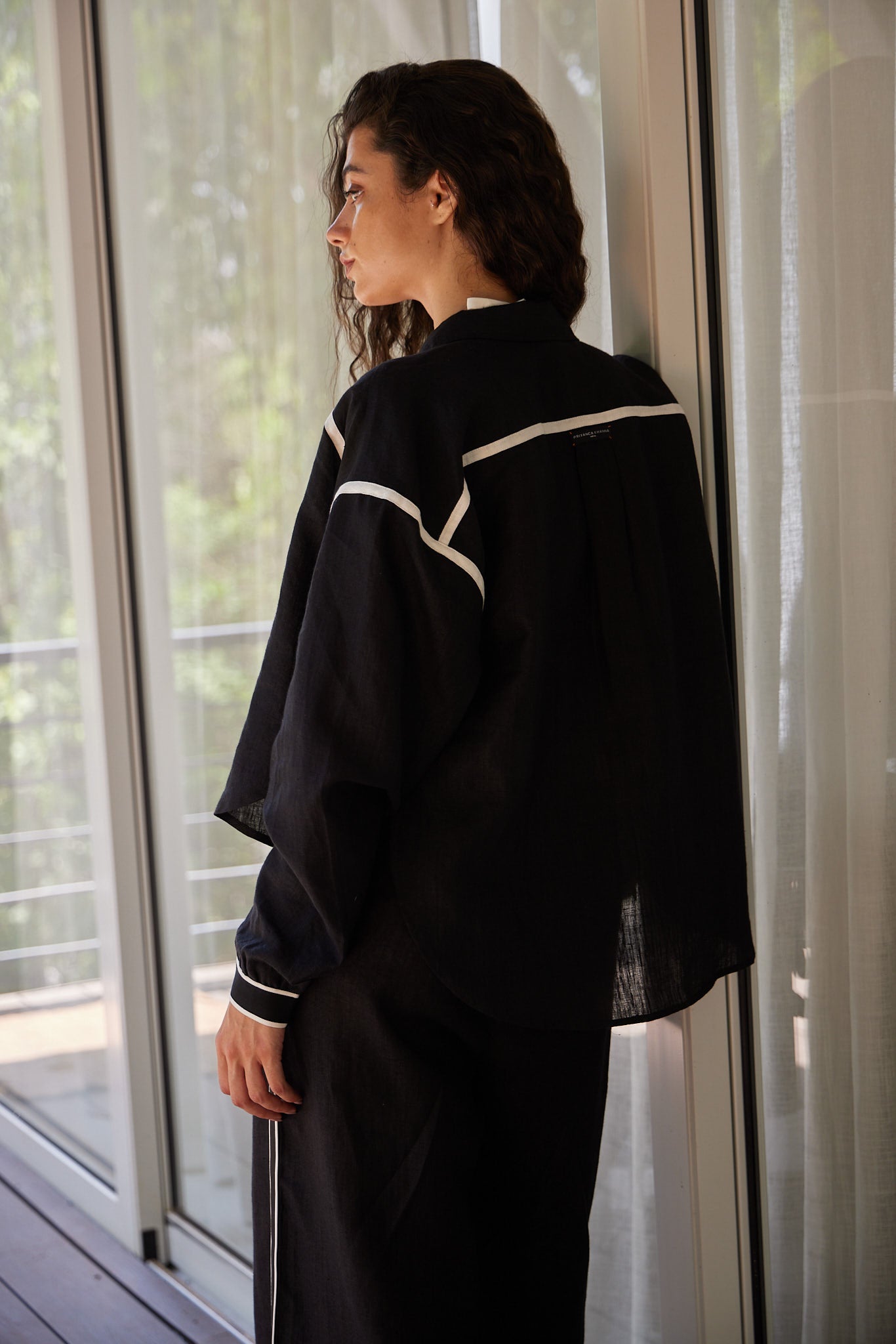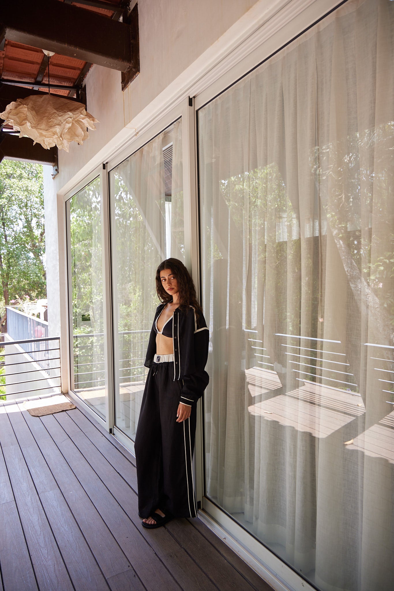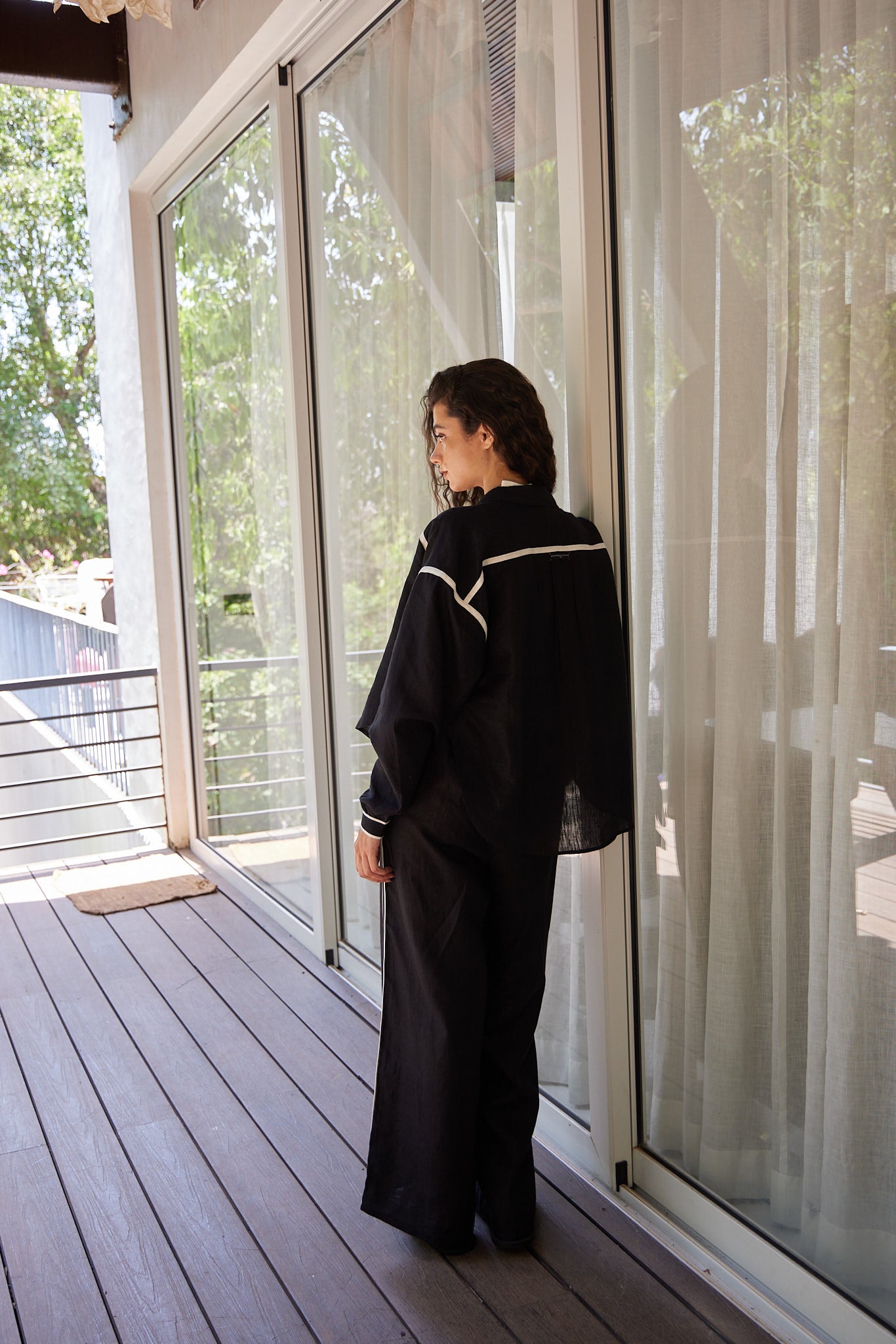 Channel peak simplicity on your next getaway in our Black Linen Co-Ord Set. Detailing to look out for? Starting with the button placket and sleeve hem fastened with black and white elastic. The black top has been highlighted with white linen fabric for sassy sartorial style. Of course, it wouldn’t be finished without a matte black tip-top button fastening. Accompanying it are a pair of black linen straight-fit pants whose waist has been highlighted with elasticated white knit fabric, representing the brand logo on the centre front. Another detail to look forward to? The black and white elastic added vertically on both sides. This co-ord set will make for the perfect ensemble for reading and lounging by the beach.