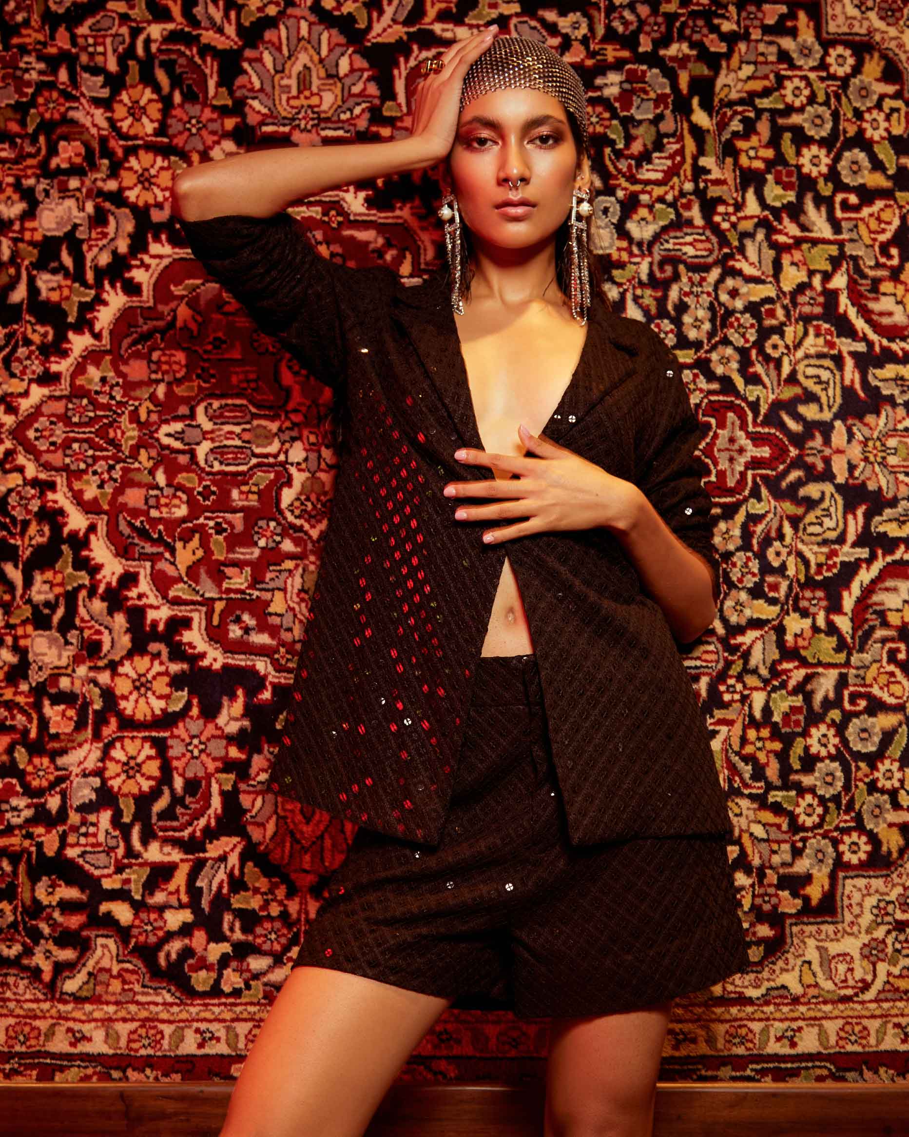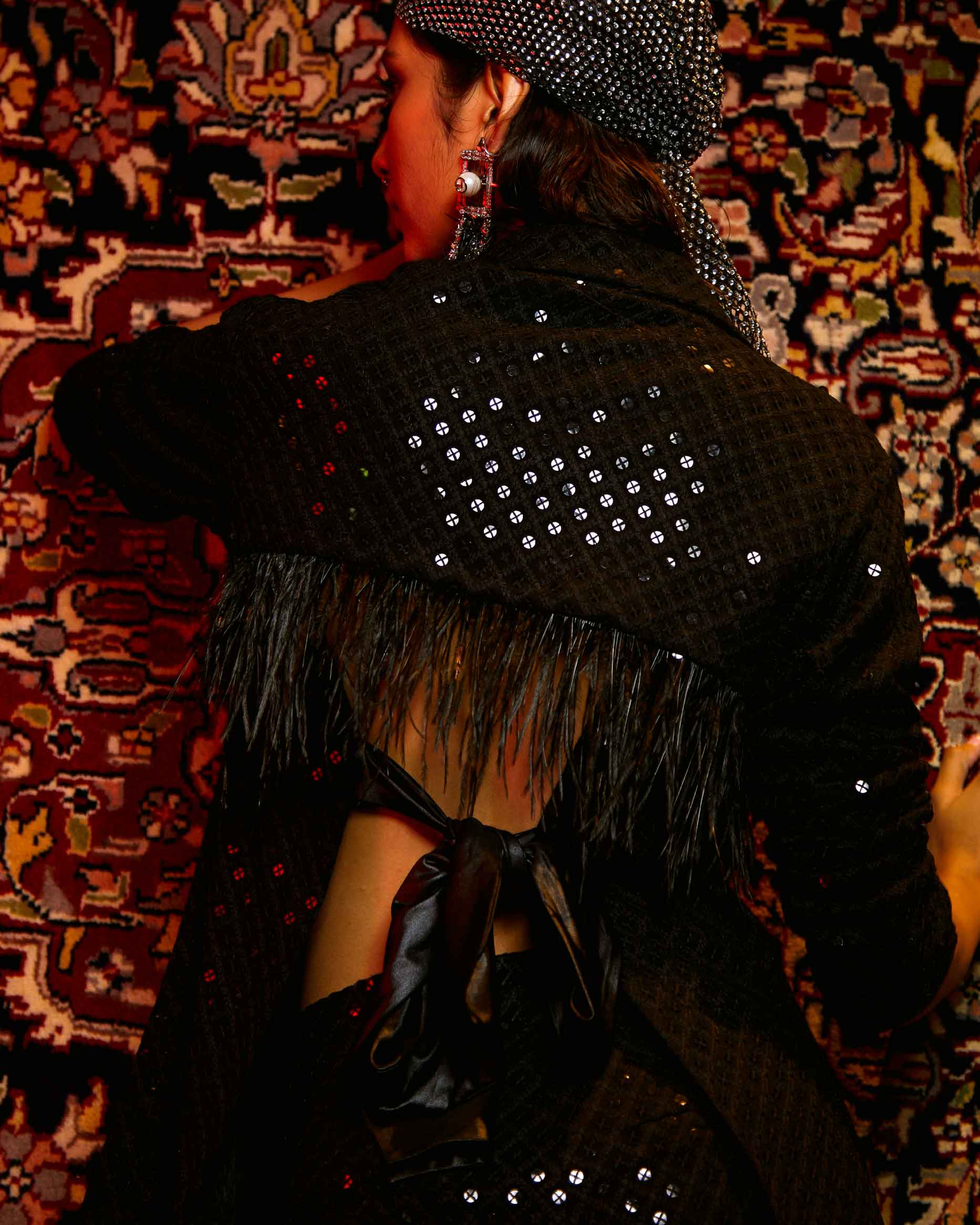 Black sequins work covers every inch of this fitted jacket. The fur details at the back add a fresh take to the usual party jackets we have now become accustomed to. The leather tie-up accompanying the set seals the deal and makes it even more stylish! Don’t forget to cherish the charm of the faux leather fringe or the fact that you can pair our high-waisted pants or shorts with this piece.