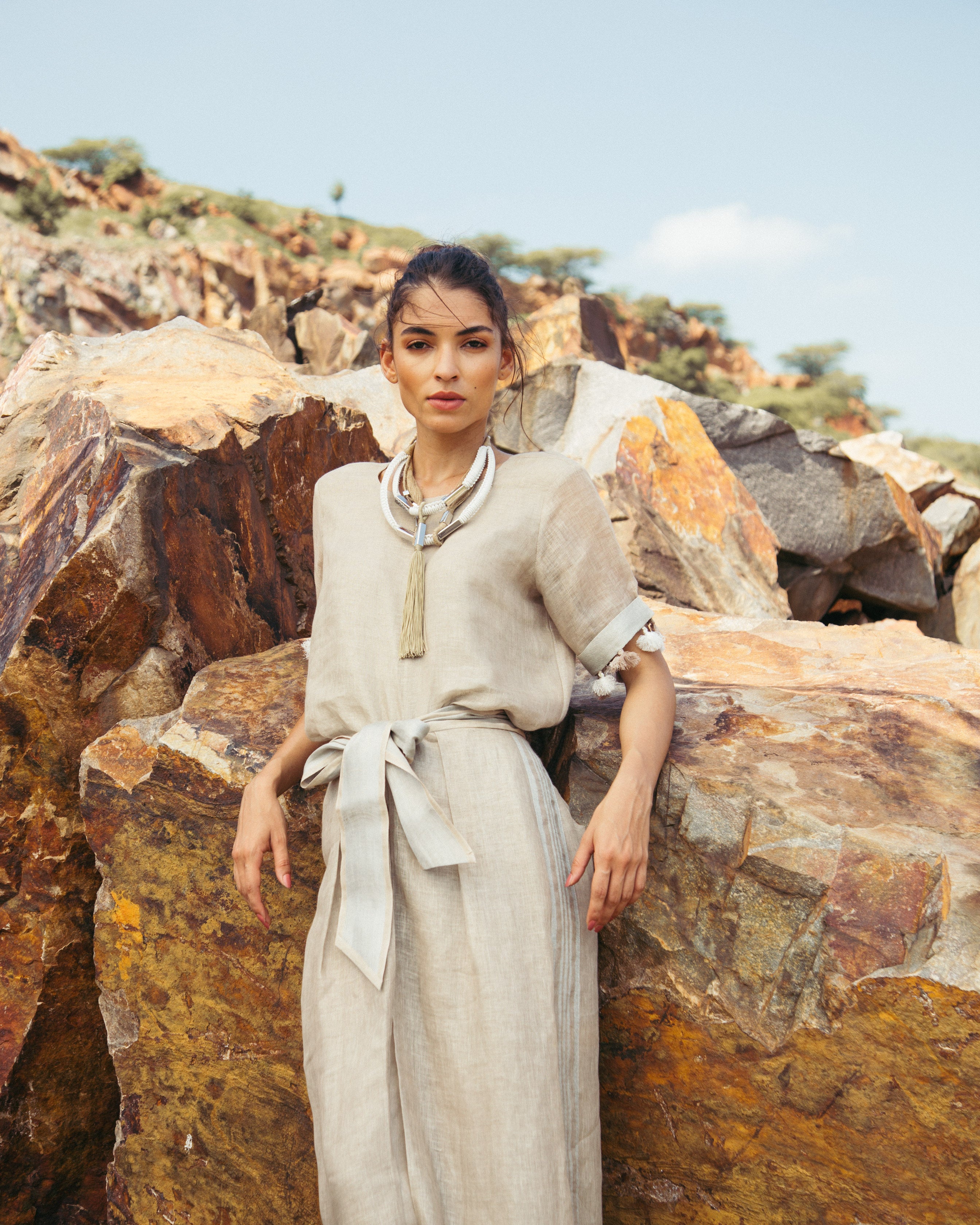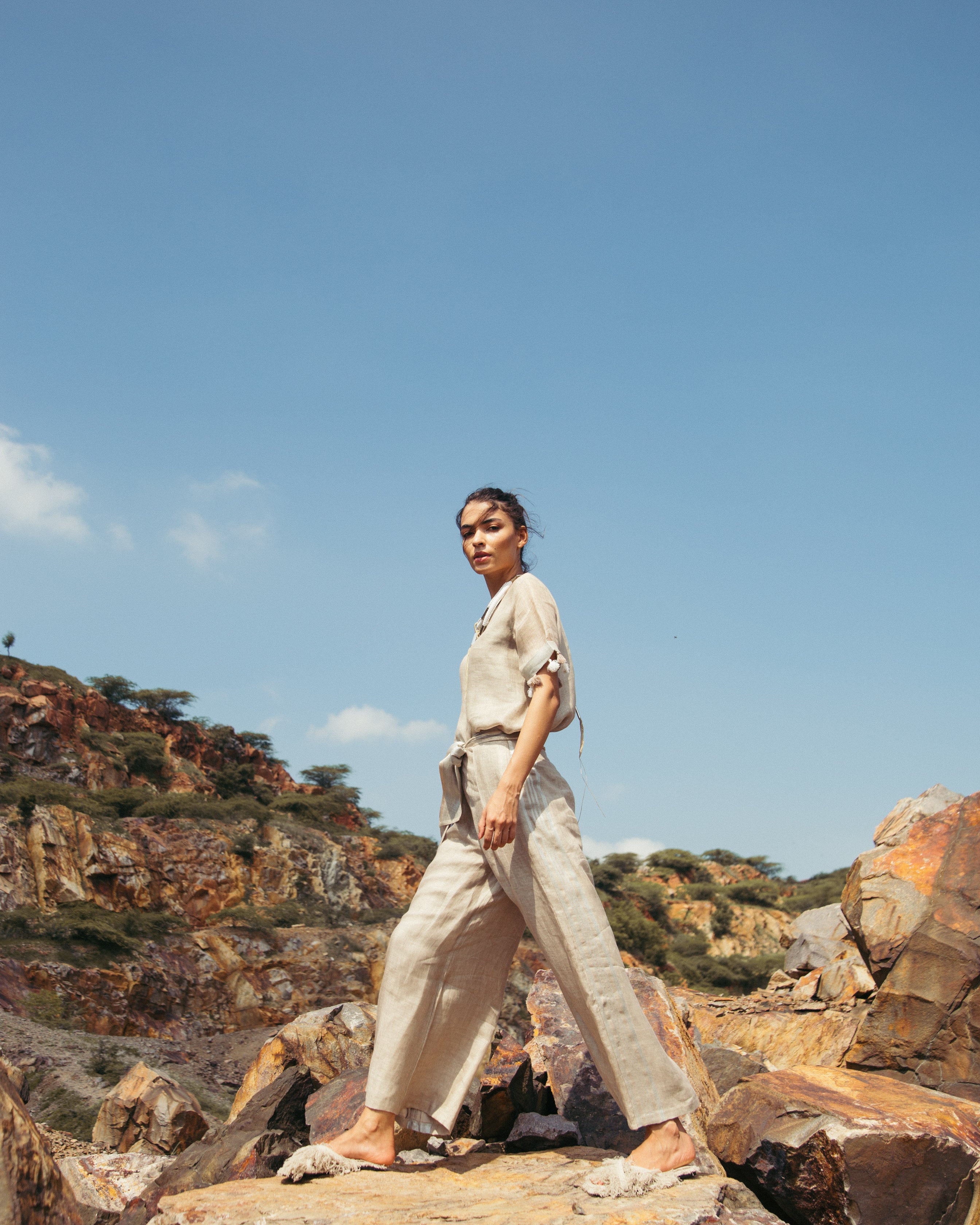 Natural linen co-ord set that can be worn separately or together depending on hour personal style preference, this multipurpose clothing comes with tassels and a high-waist lace tie.