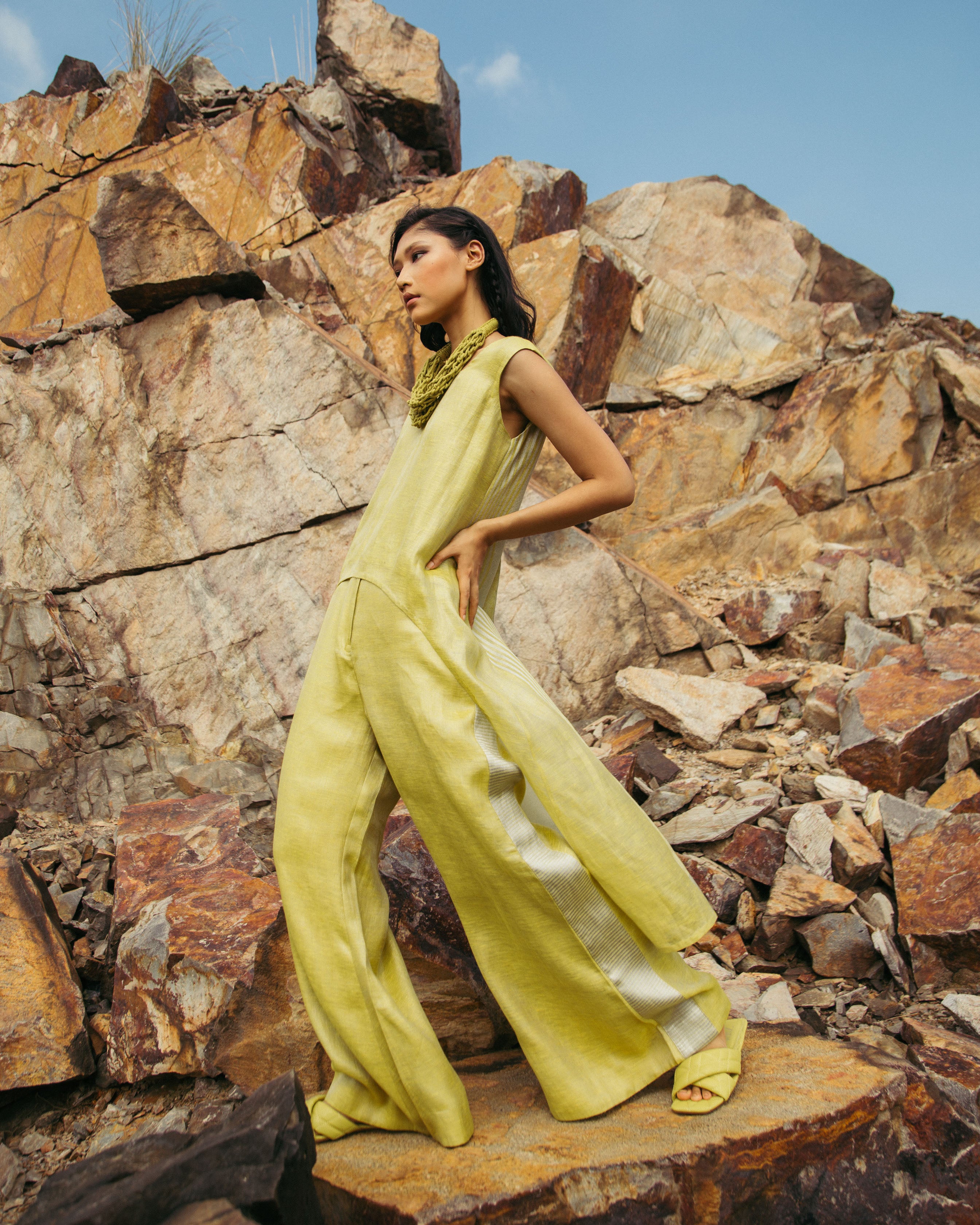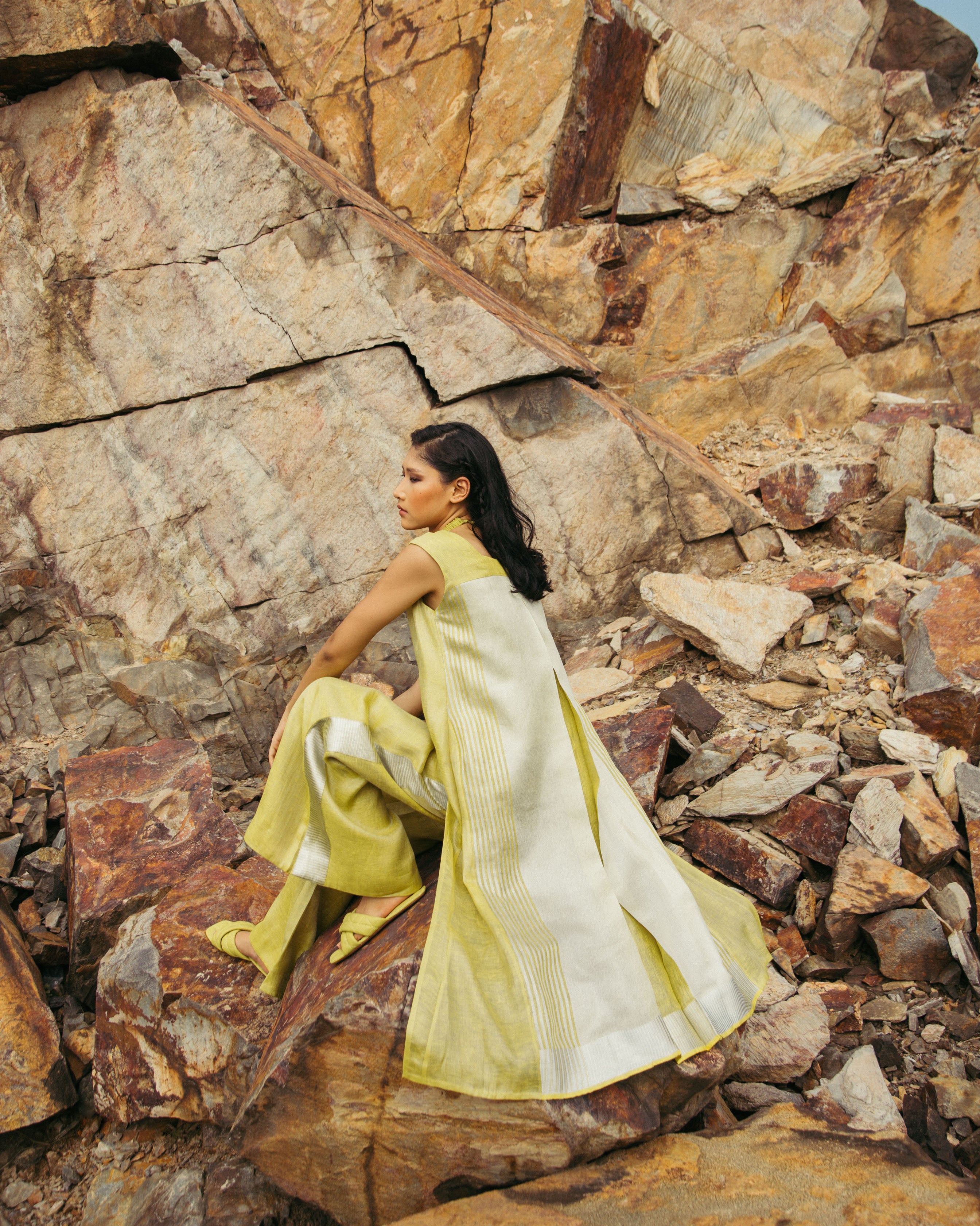 Unique colour of limelight linen, tailored into a co-ord set, comes with a high-low sleeveless top and wide-leg pants. Juxtaposed with silver stripes adds to the fashion exuberance you are looking for to make a statement every time you wear it.