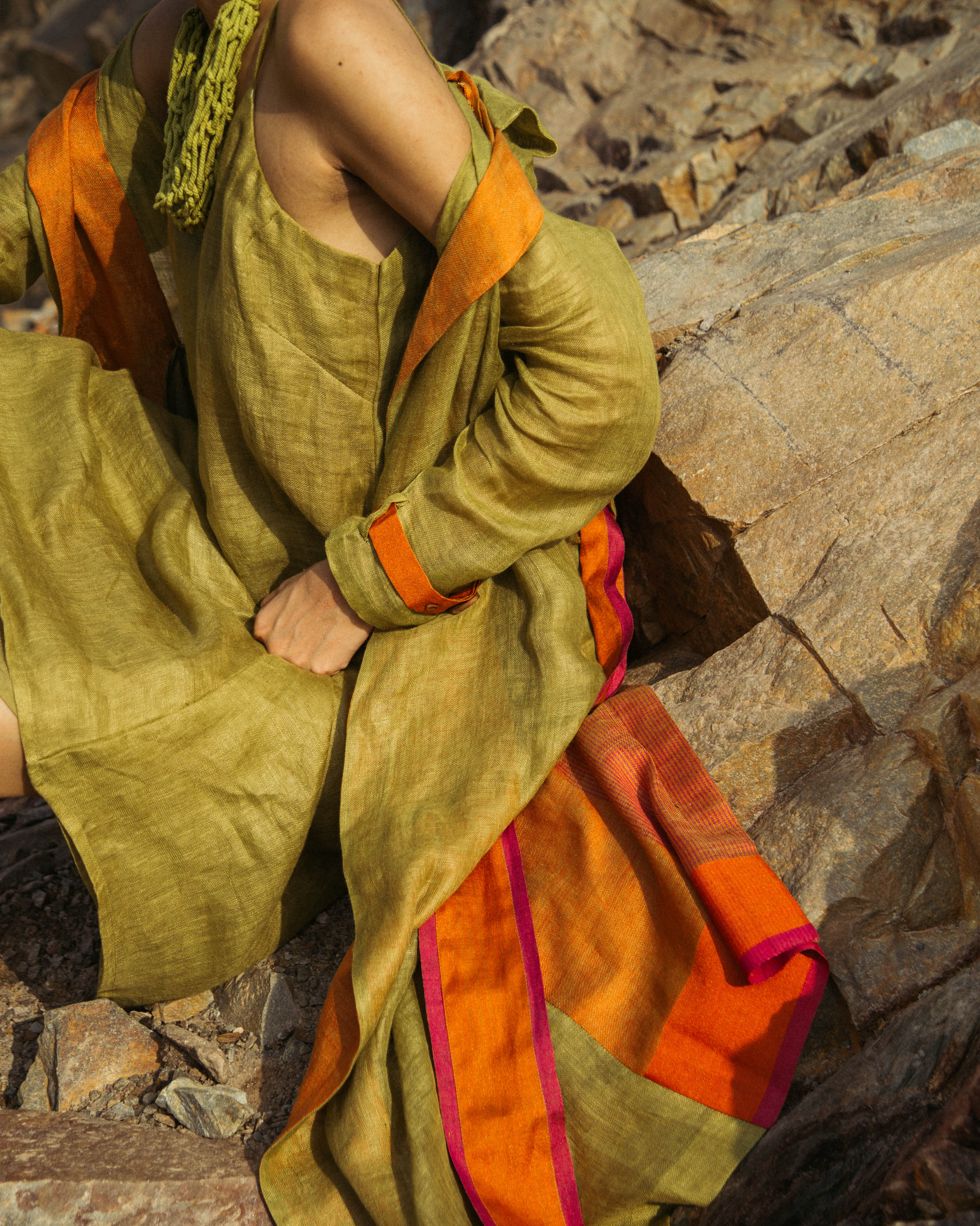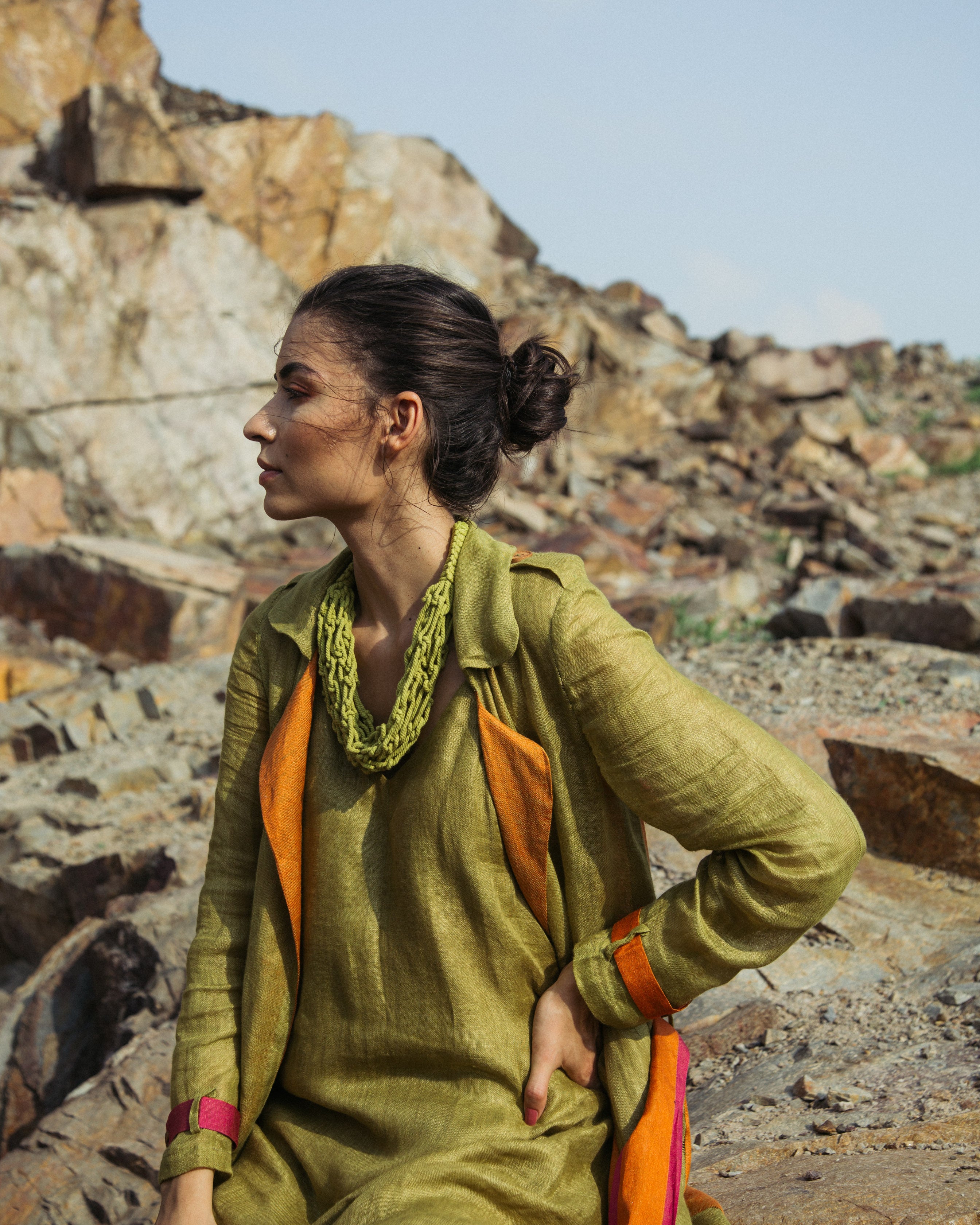 Golden lime set comes with a slip dress and trench, boldly contrasted with orange lace tie, lapel and back with fun tassels attached.