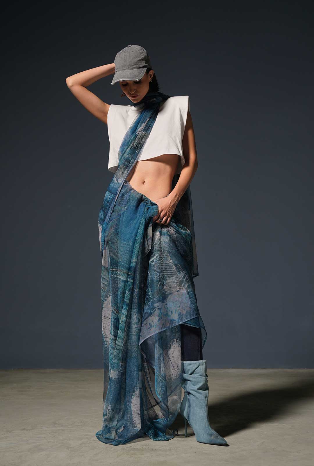 As you drape yourself in the Denim Collage Saree, adorned with the Crop Knitted T-Shirt Blouse, Statement Neckpiece, Denim Boots, and Cap, you're not just wearing an ensemble; you're making a statement.