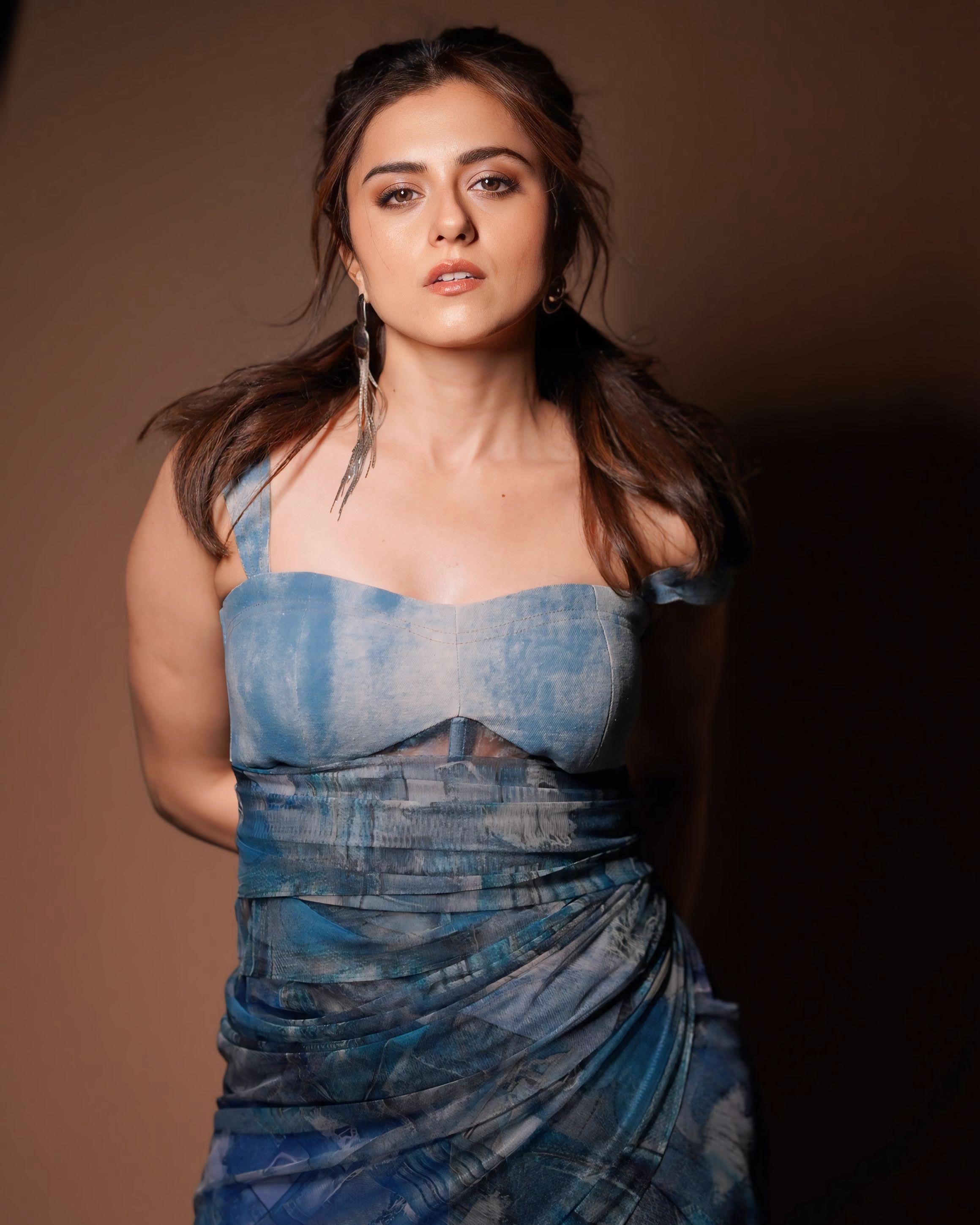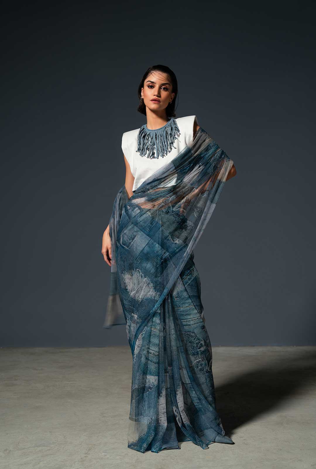 At the core of this ensemble lies the "Denim Collage Saree," a celebration of denim's timeless appeal. A collage of denim patches, digitally printed onto delicate net fabric, forms a captivating narrative.