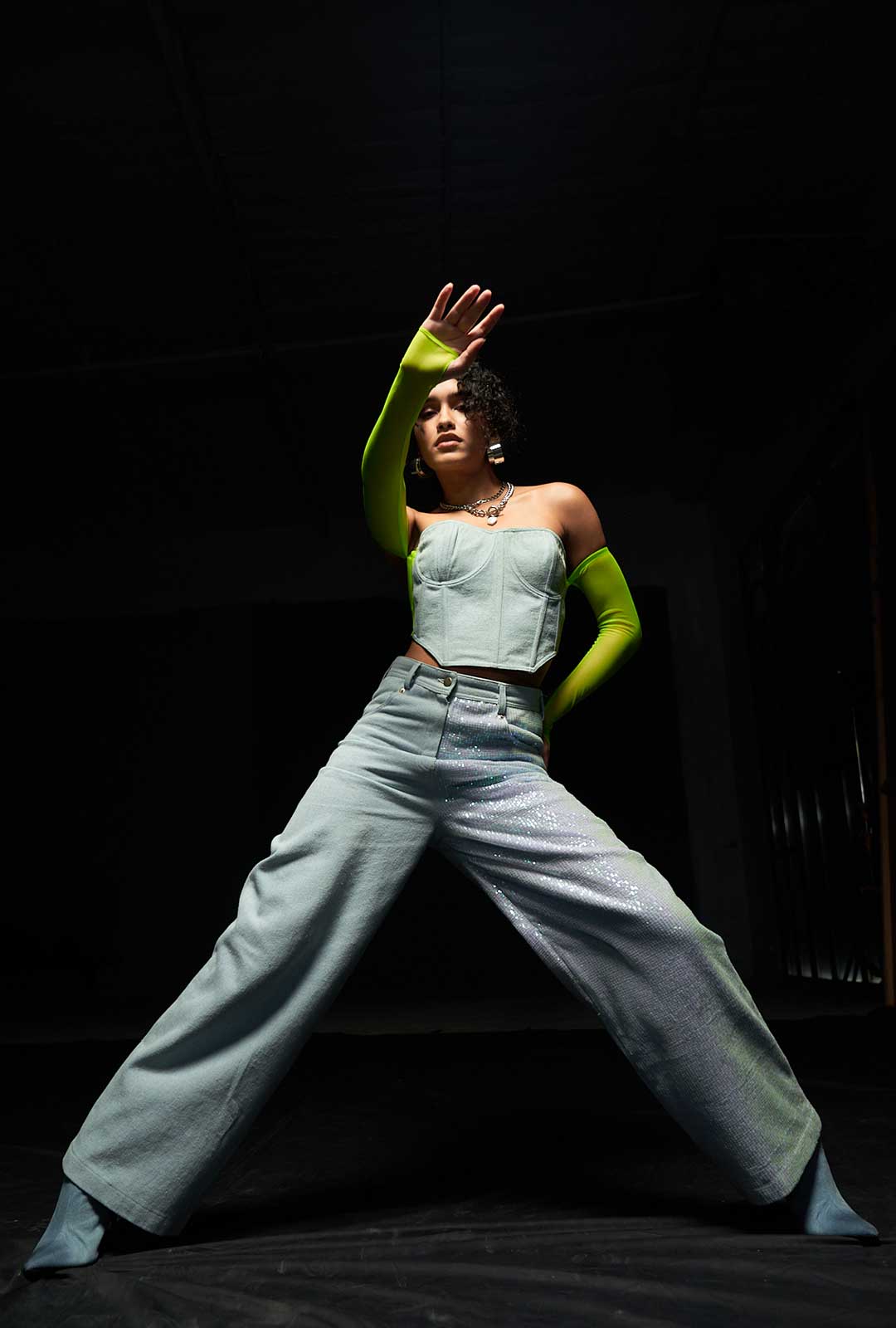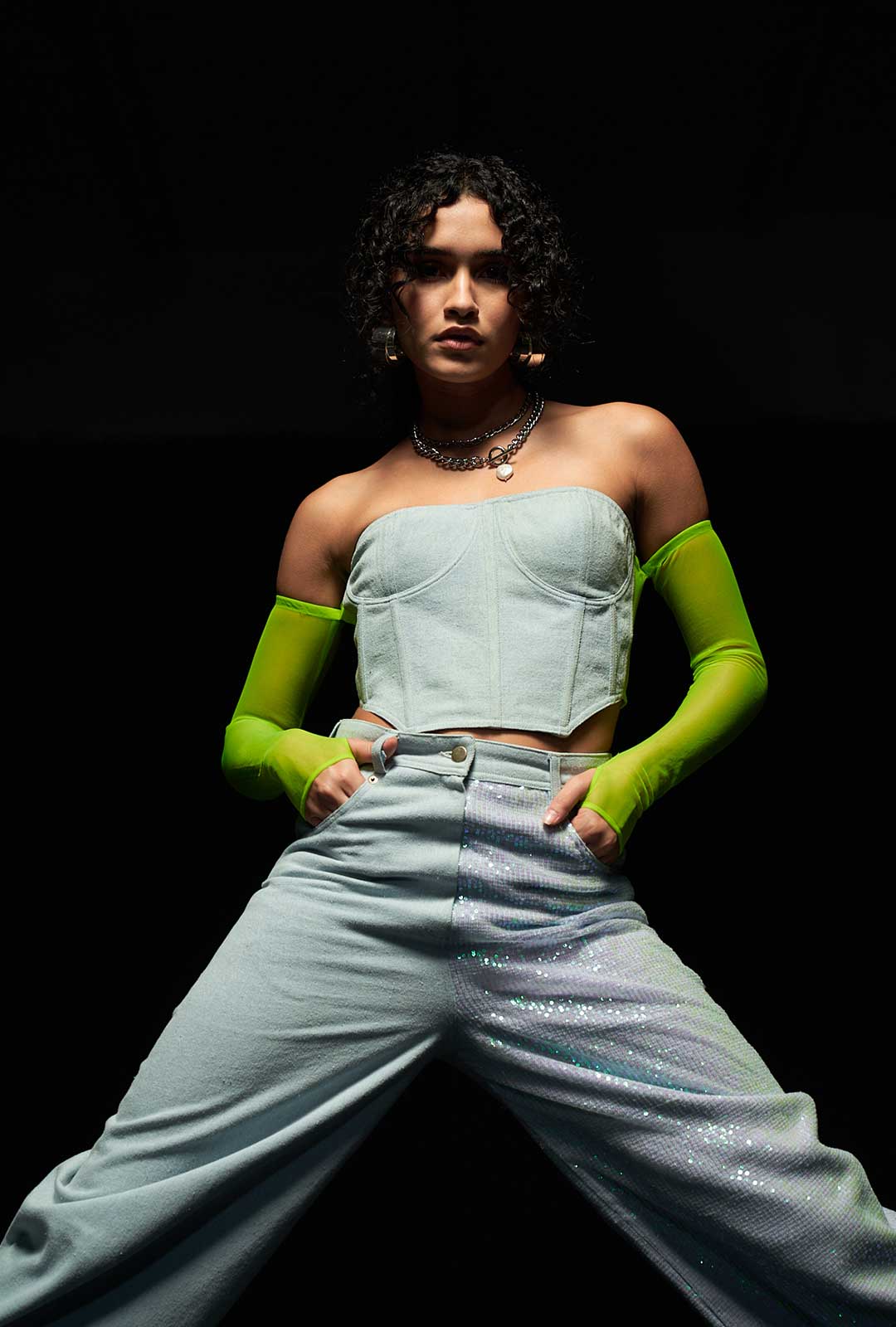 Introducing our Light Blue High-Waisted Denim Pants, a true masterpiece from the collection. These pants redefine denim with a daring twist, offering a contemporary take on classic style. The high-waisted design ensures a flattering fit, while the unique feature of these pants lies in their captivating contrast. One side showcases the timeless charm of plain denim, while the other half glistens with an array of sequins, adding an undeniable touch of glamour. This captivating duality represents the essence of Fragmented Reality - where the unexpected becomes a work of art. Perfect for those who crave both comfort and extravagance, these pants are versatile enough to dress up or down, making them an ideal choice for both daytime sophistication and nighttime allure. Whether you're stepping into the spotlight or making a statement at a casual gathering, these pants invite you to explore the uncharted boundaries of fashion with a spirit of individuality and confidence.