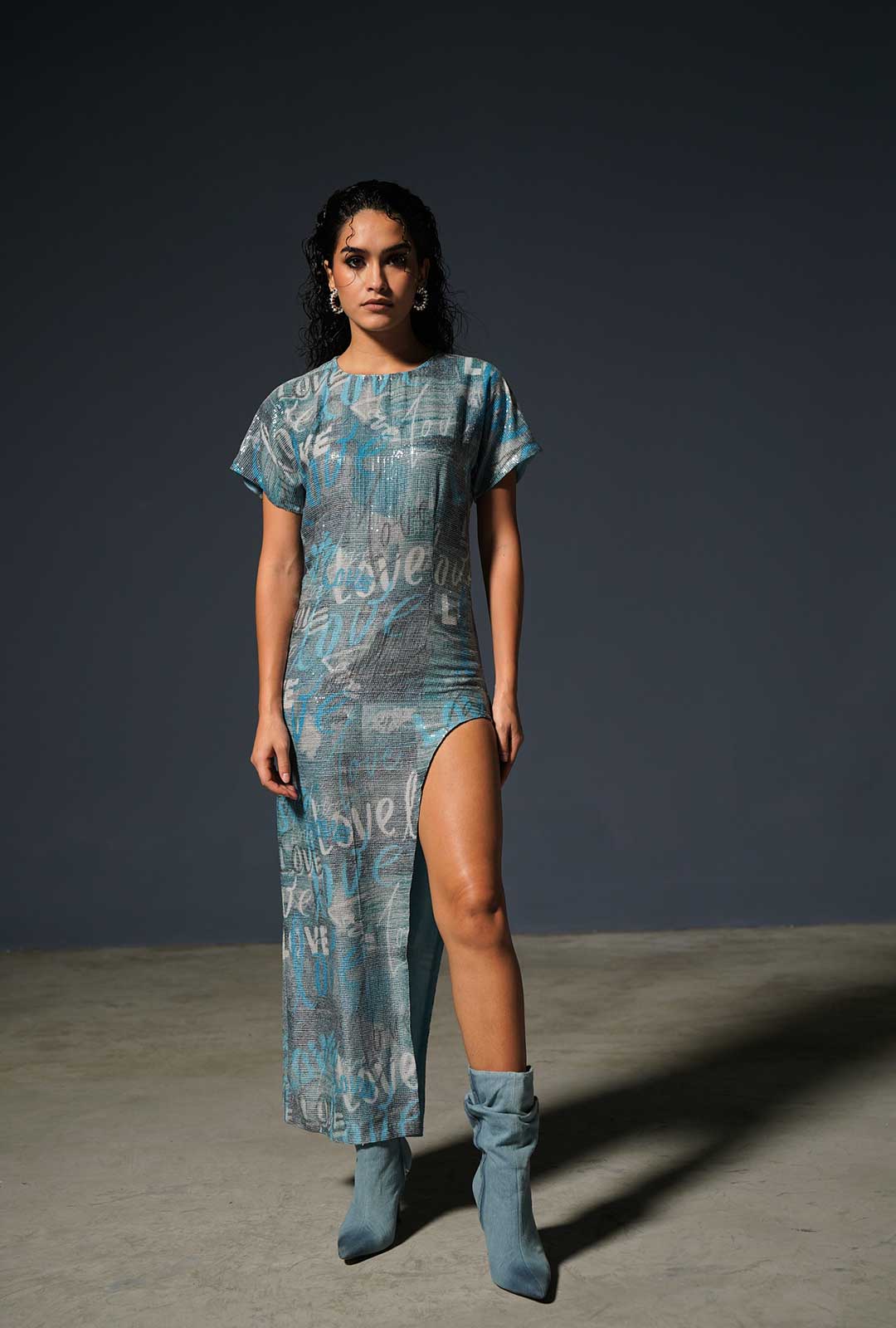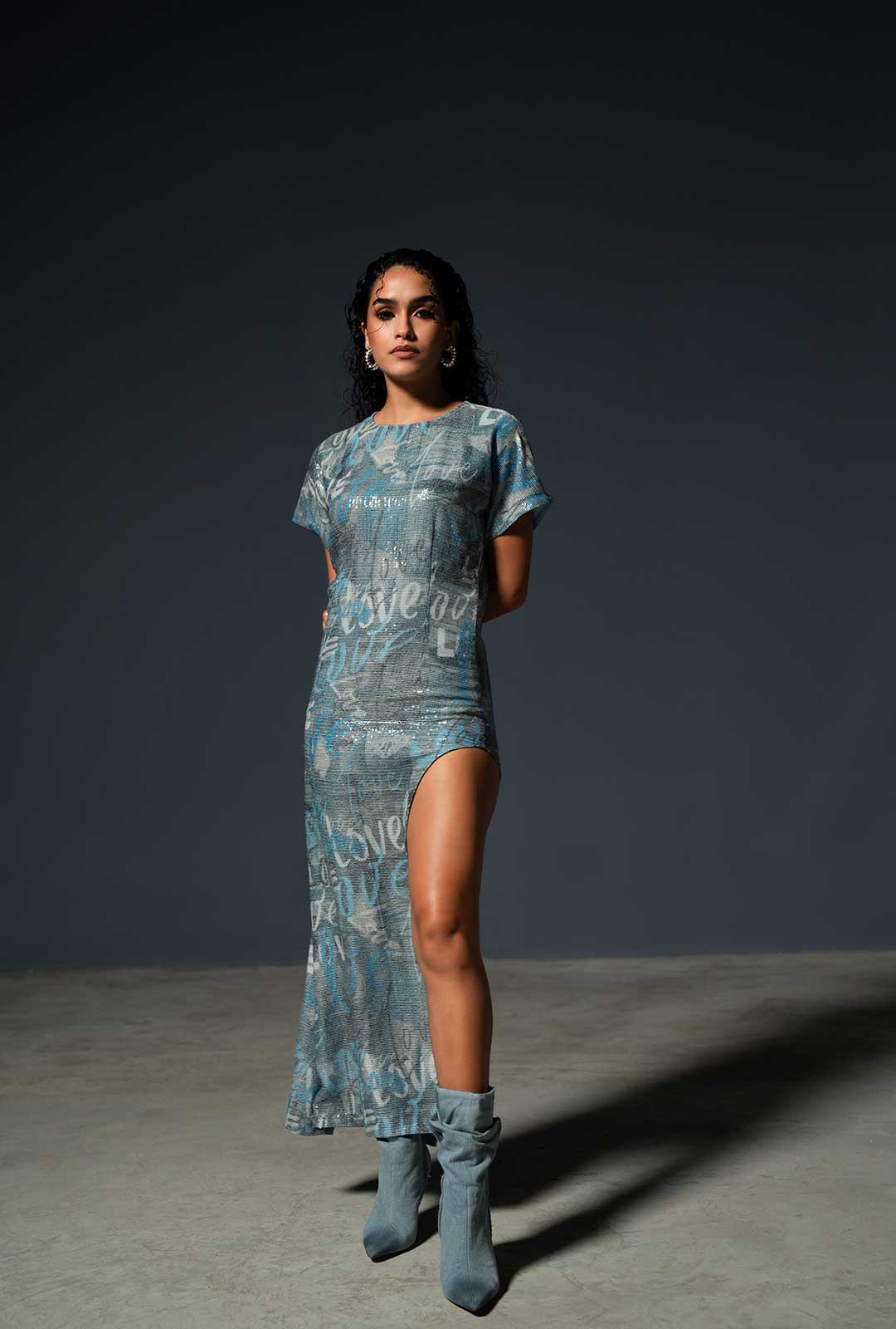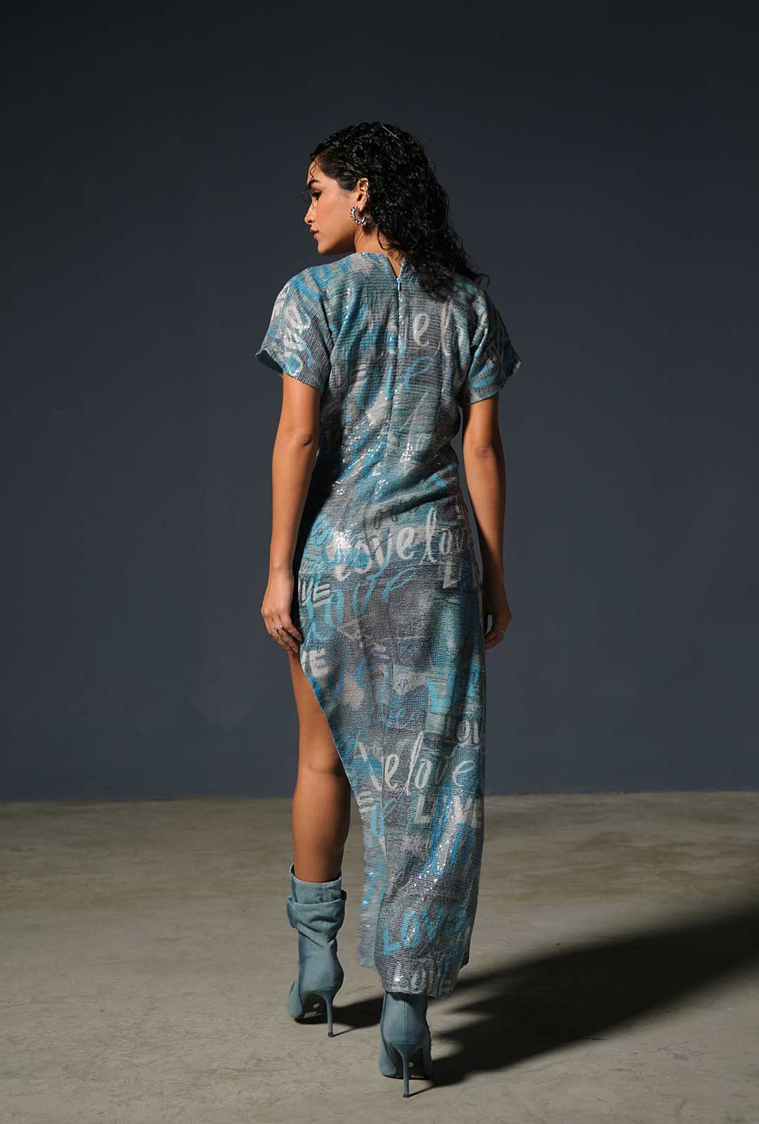 This dress is a striking fusion of shimmering elegance and self love. The denim print adorned with the word "Love" adds a sense of rebellion and individuality to the ensemble. It's a testament to the idea that fashion is a canvas for self-expression.
