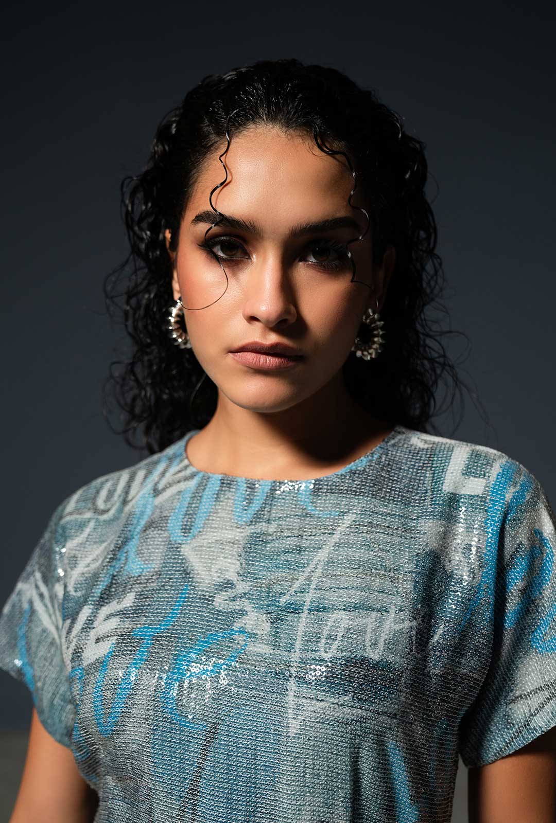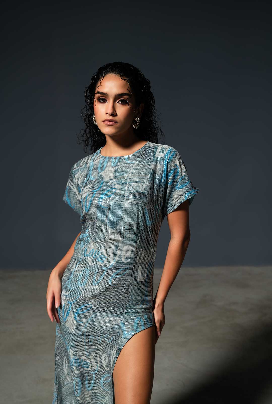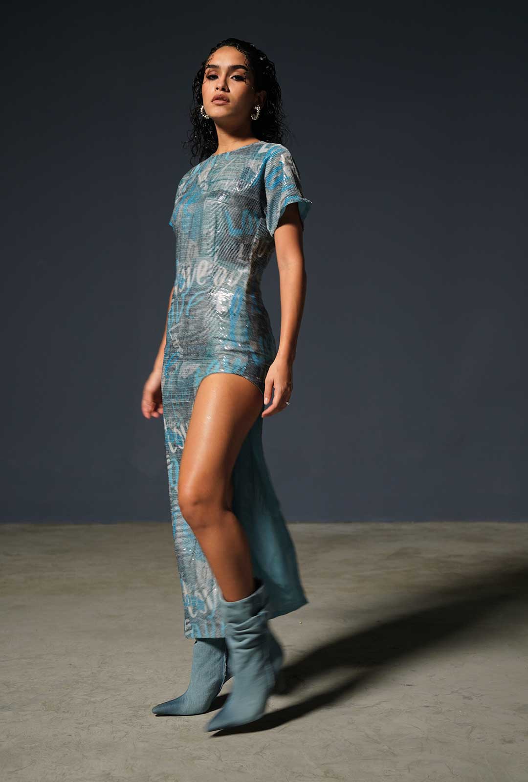This dress is a striking fusion of shimmering elegance and self love. The denim print adorned with the word "Love" adds a sense of rebellion and individuality to the ensemble. It's a testament to the idea that fashion is a canvas for self-expression.