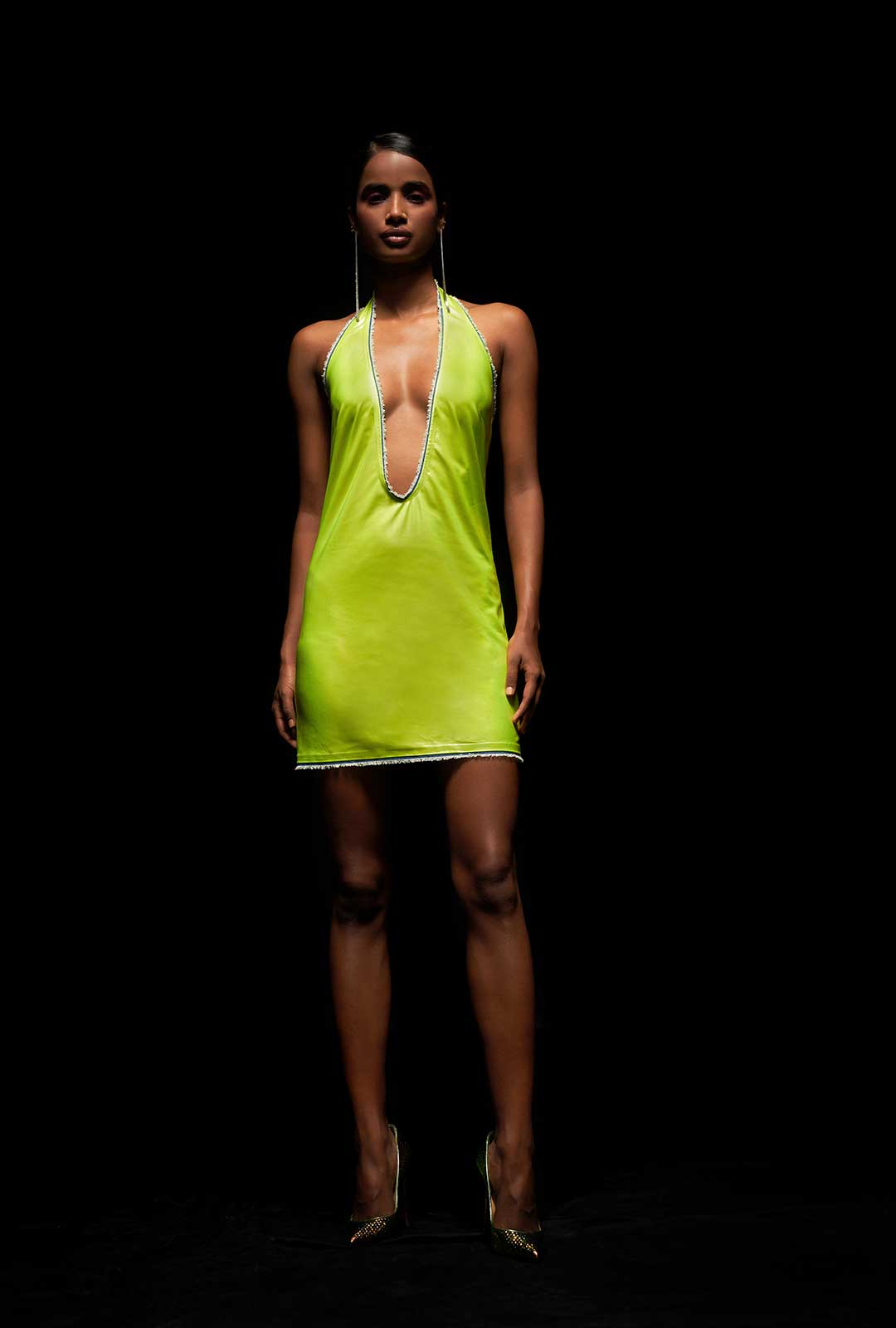 This dress is a harmonious blend of edginess and elegance, designed for those who dare to stand out. Crafted from high-quality rexine, the dress embraces your form with a flattering fit that exudes allure. The low halter neckline adds a touch of sophistication, while the unexpected twist of denim patch lines on the back, neckline, and hem brings a playful element of surprise. These denim patches, a signature feature of our collection, seamlessly integrate with the neon green backdrop, showcasing the art of contrast. The dress boasts a daringly long zip fastening on the back, allowing you to slip into the vibrant world of Fragmented Reality effortlessly. Whether you're hitting the city's hottest nightspots or making a memorable entrance at a special event, this dress will capture attention and ignite conversations.