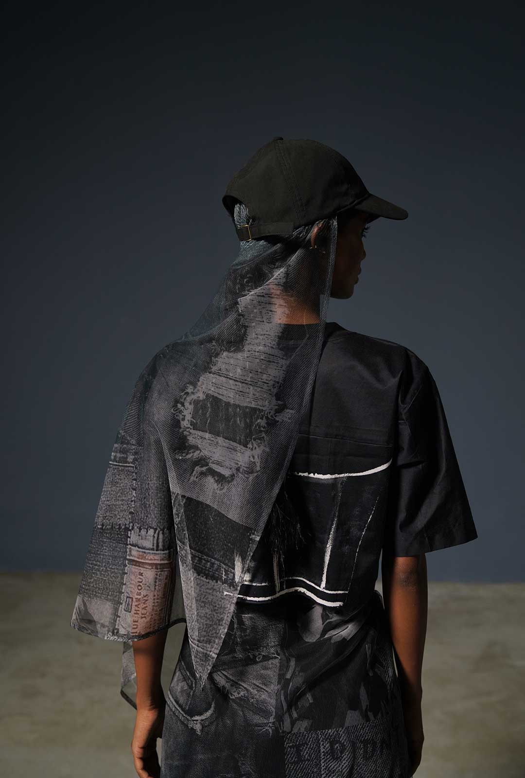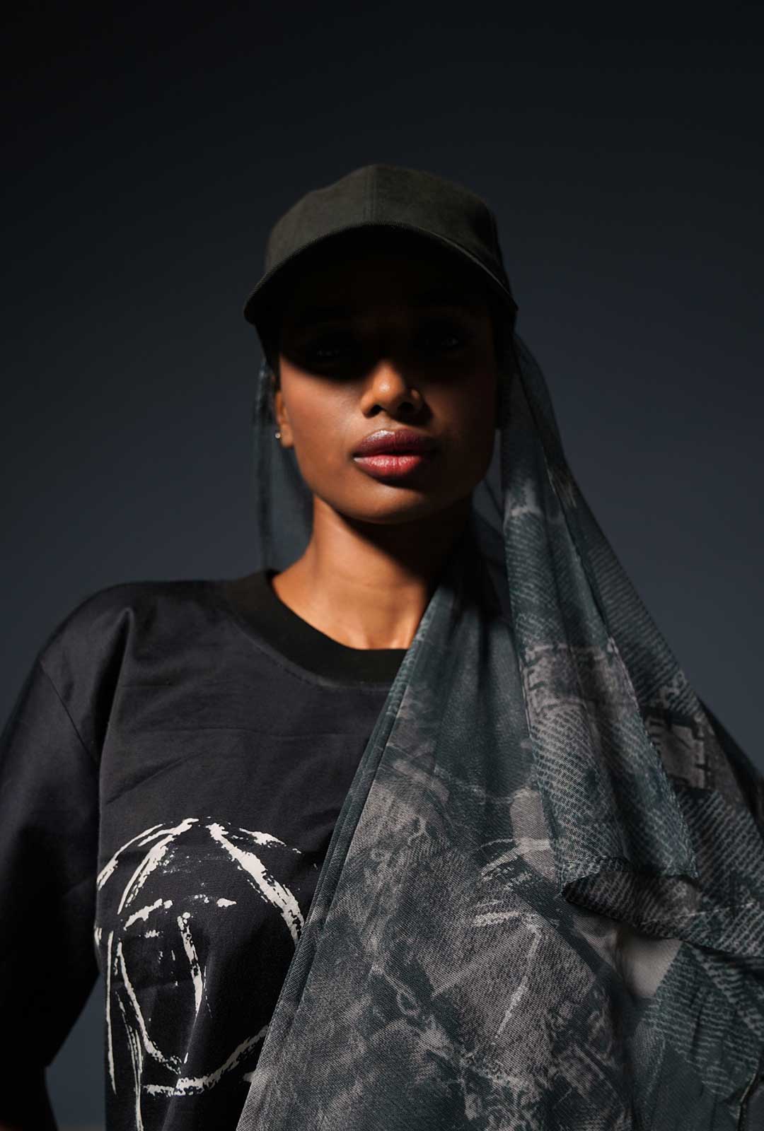 This striking t-shirt boasts a round neck and dropped shoulders, creating an effortlessly chic silhouette. Its loose half sleeves contribute to its relaxed, contemporary charm. But what truly sets this garment apart is its print. The front and back proudly display a white corset, reimagined as a graphic print. It's a bold concept: the corset, an emblem of restriction and formality, is now depicted in a loose, carefree form.