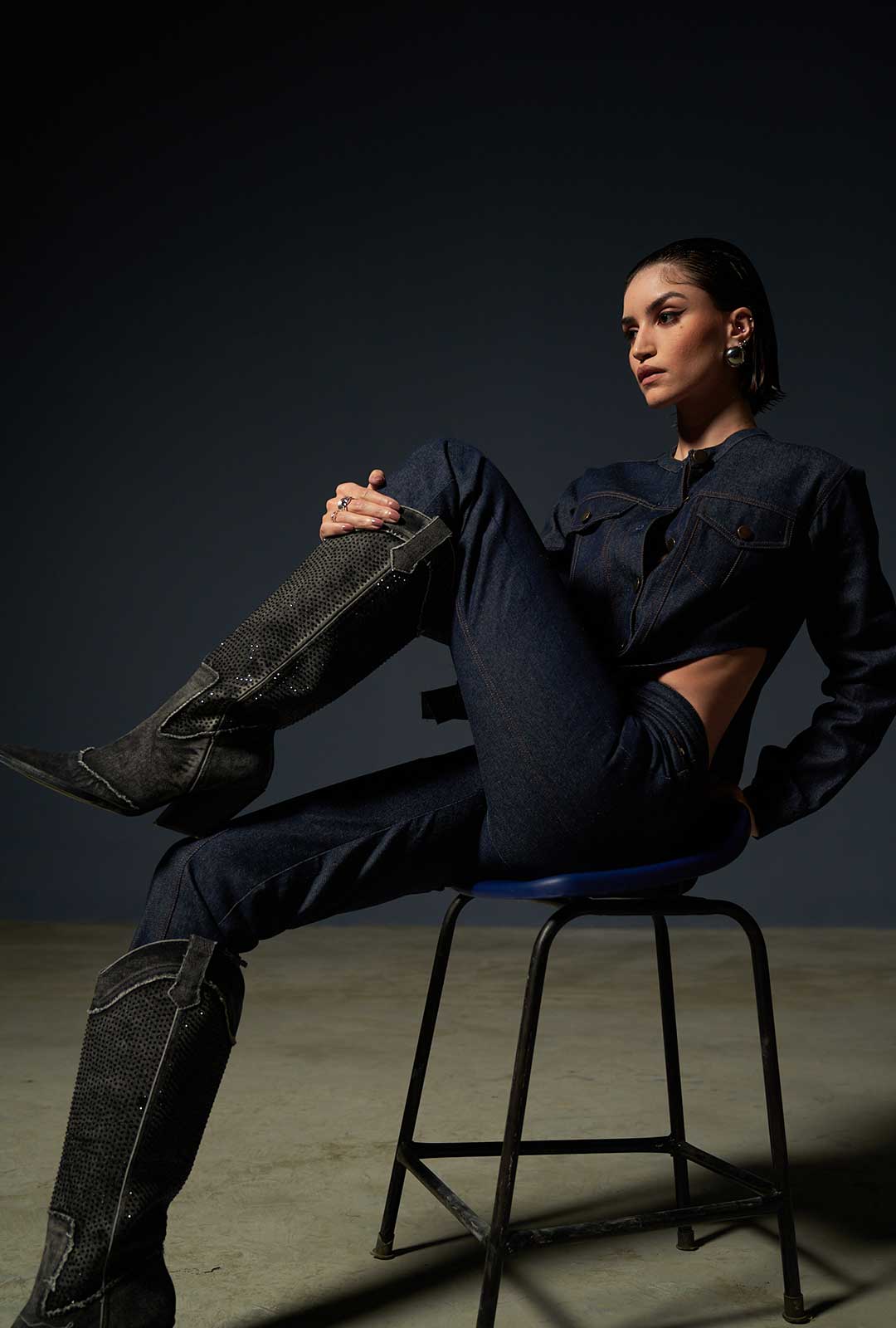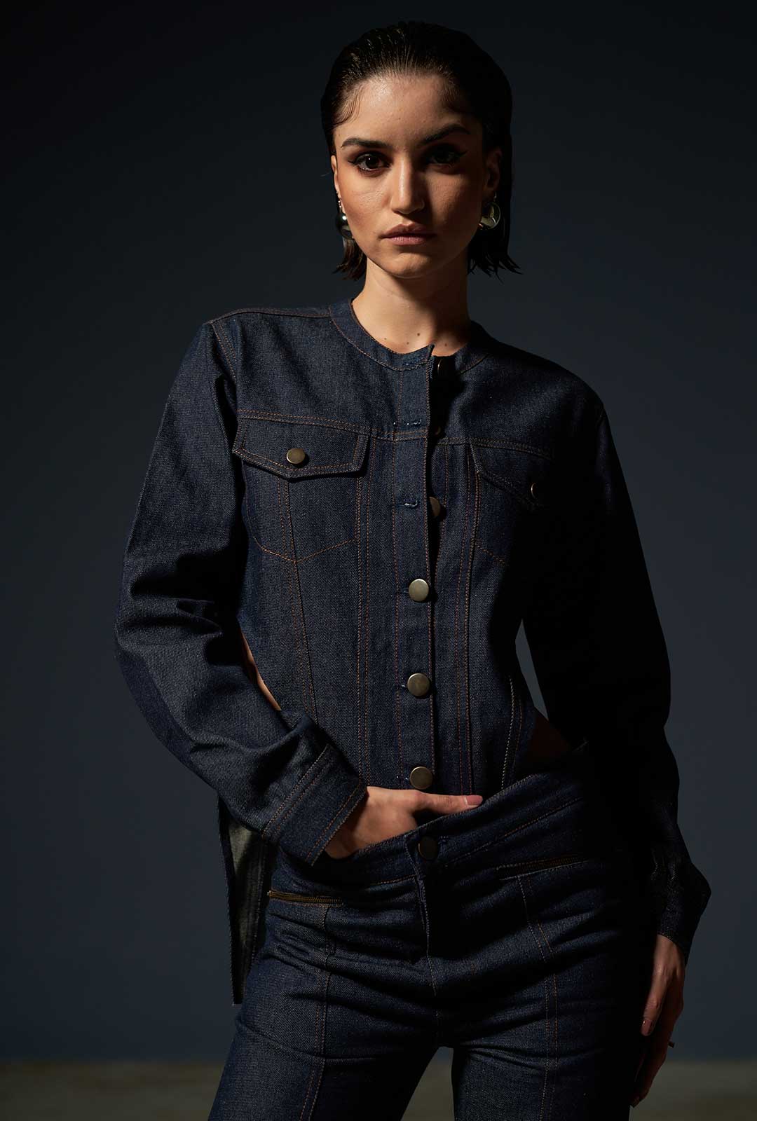 Embrace fearless fashion with our Denim Bodysuit Shirt, a game-changing ensemble. This bodysuit shirt redefines denim's possibilities, featuring daring deep cuts on both sides that add a tantalizing twist to the traditional. The unfinished bottom offers a revolutionary choice - you can tuck it in for a classic look or wear it out for an edgier vibe, giving you the freedom to adapt your style on a whim. The shirt's front boasts a metal button fastening, adorned with two pockets for an extra dose of style. This versatile piece comes complete with straight semi-fitted low waist pants, each pocket equipped with metal zips for a touch of industrial chic. Whether you're taking to the city streets or stepping into the limelight at a special event, this ensemble invites you to explore the realms of fashion, where innovation meets boldness in the world of Fragmented Reality.