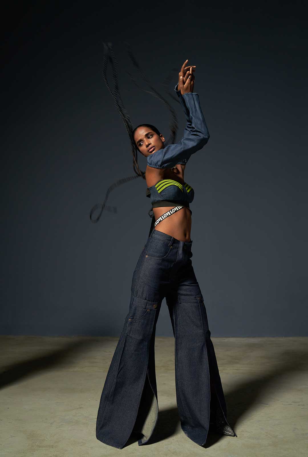 What truly sets these pants apart is the replication of the zip fly and metal button fastening on both thigh areas. This design element, along with the big slit in the centre of the pant, adds an element of drama and playfulness to the ensemble.