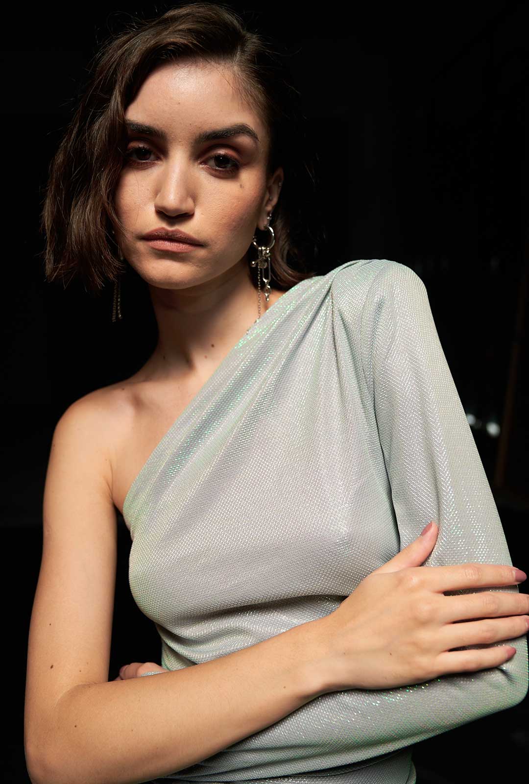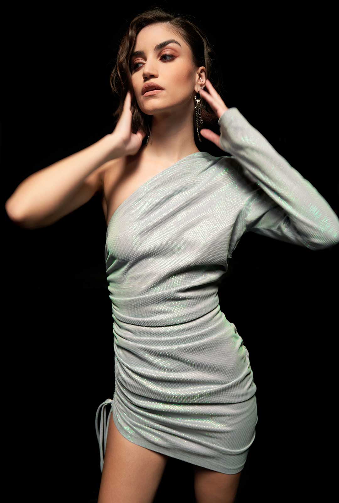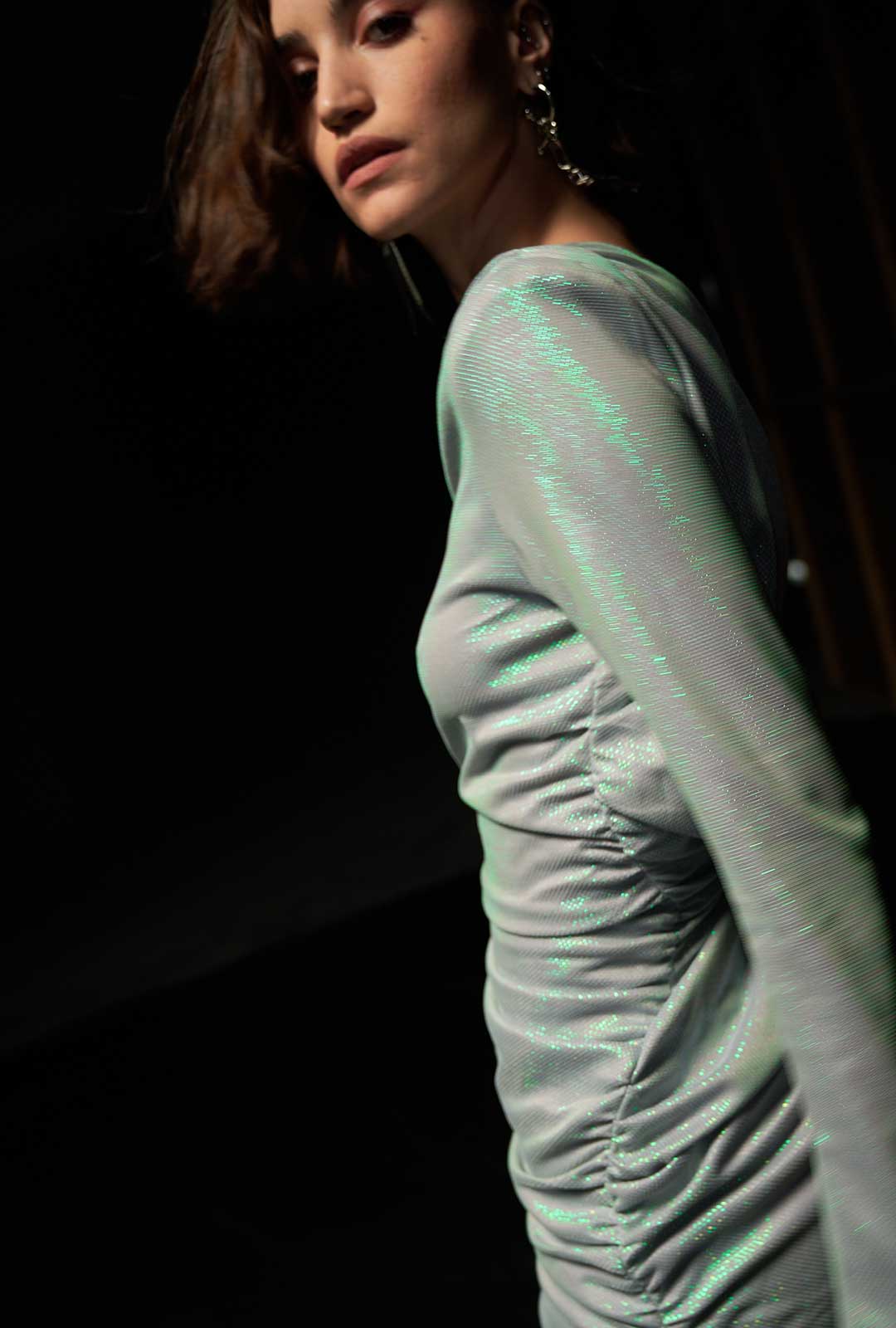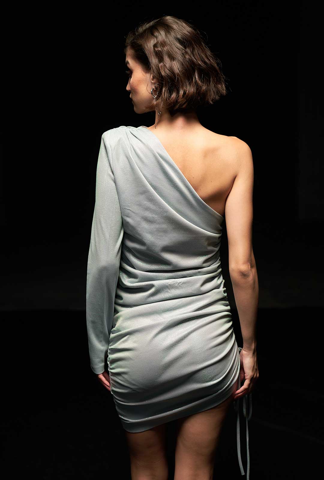 Step into the spotlight with our Holographic Two-Tone Knit Dress, a mesmerizing creation from the collection. This short dress invites you to shine and embrace your individuality wherever you go. The bluish-green metallic fabric forms the base of this dress, creating an eye-catching and unforgettable look. The one-shoulder, asymmetric neckline with a thumbhole design on the sleeve adds a touch of uniqueness and allure. On one side of the dress, you'll find gathered details with an adjustable string, allowing you to customize the fit and the level of gathering to your liking. This design element adds a playful and intriguing twist to the dress. A concealed zip on the side ensures ease of wear.