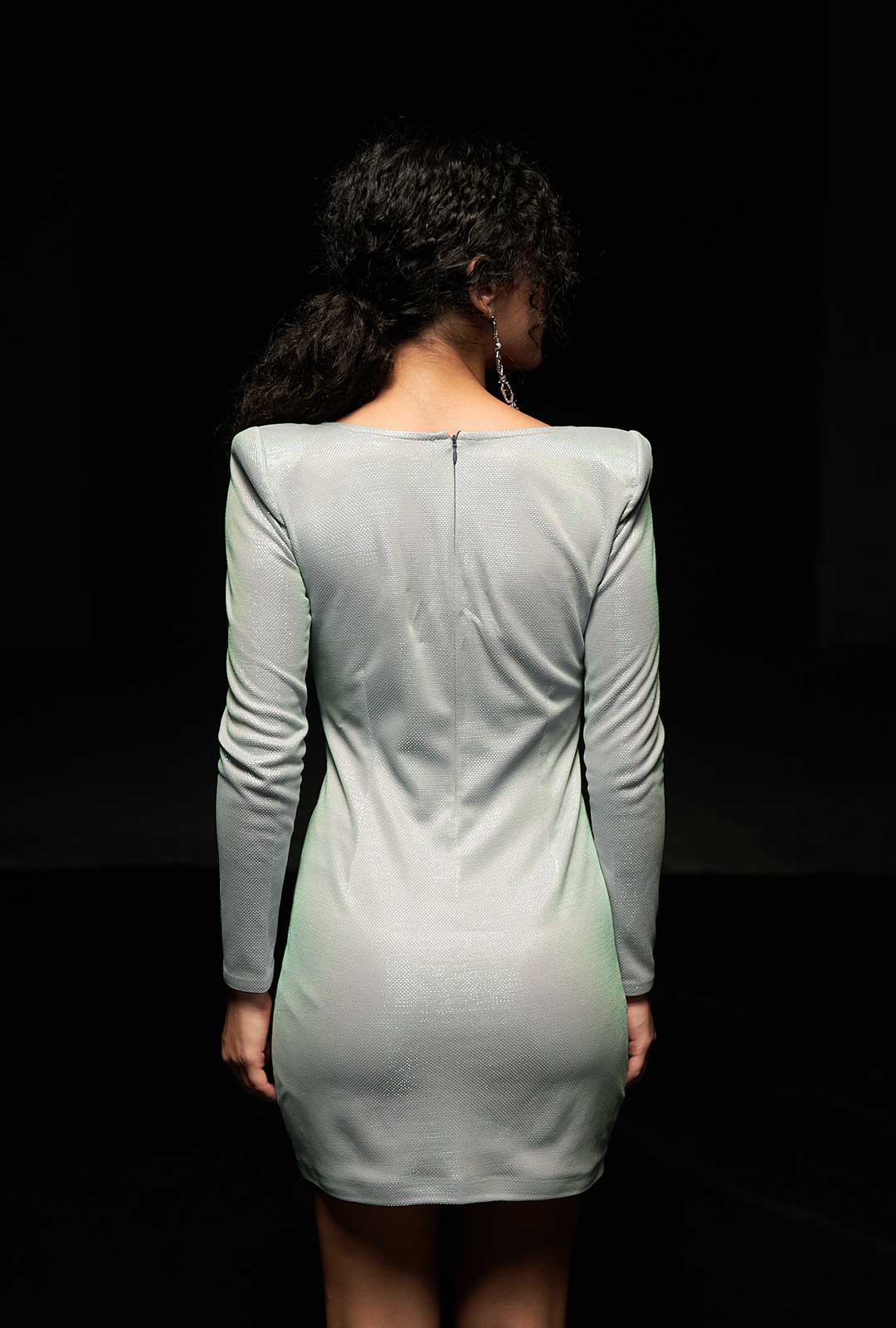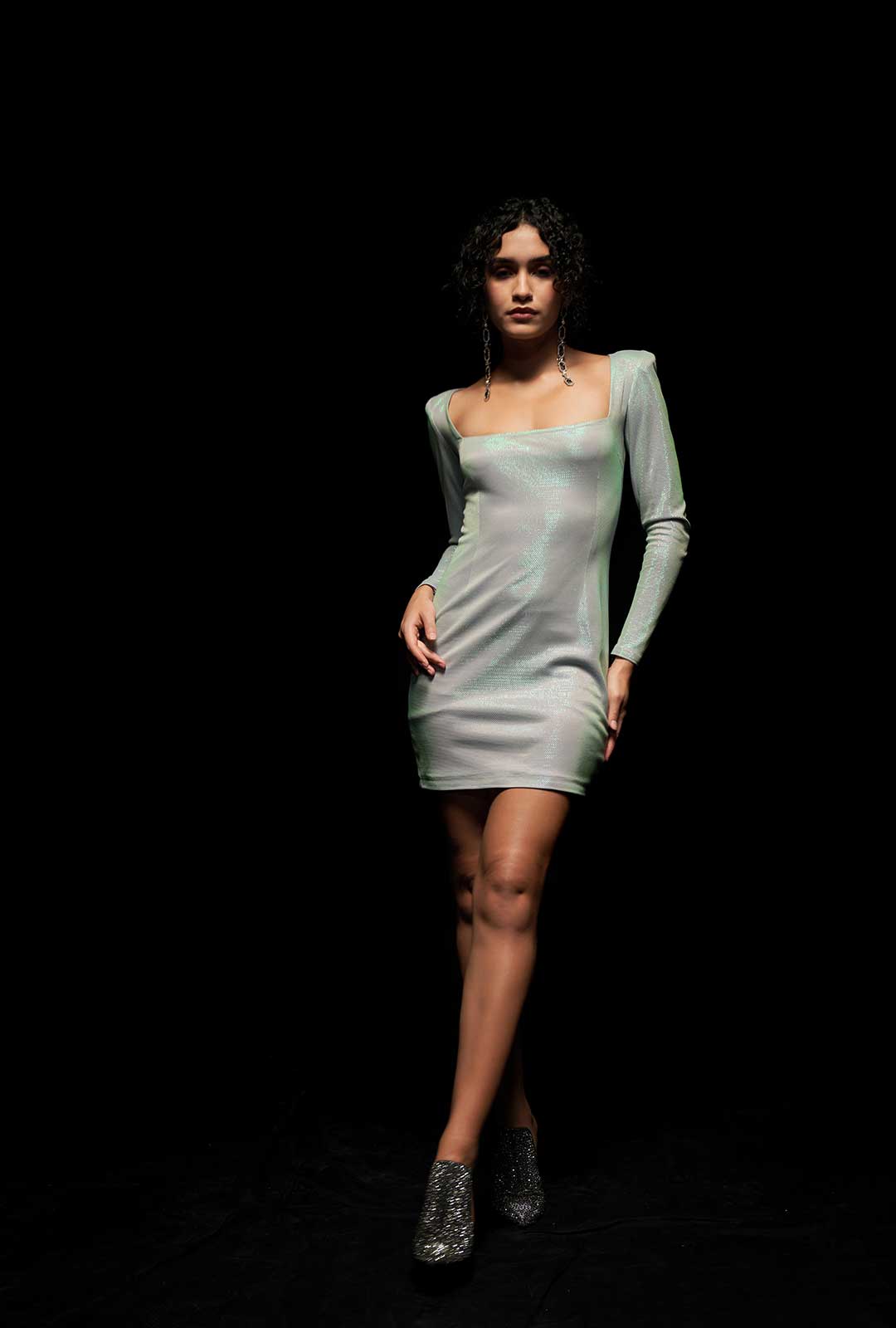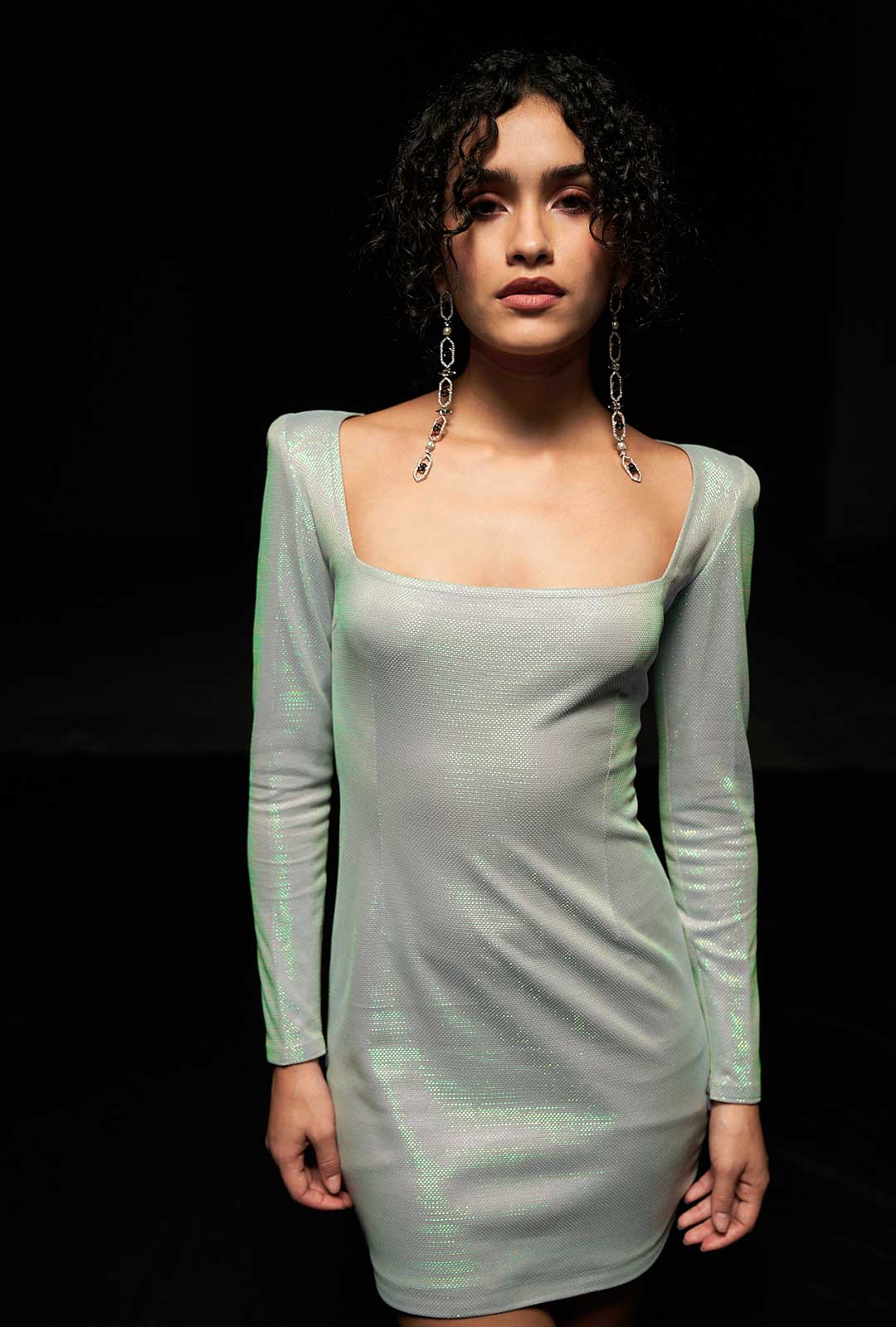Step into the spotlight with our Holographic Two-Tone Knit Dress, a mesmerizing creation from the collection. This short dress invites you to shine and embrace your individuality wherever you go. The bluish-green metallic fabric forms the base of this dress, creating an eye-catching and unforgettable look. The one-shoulder, asymmetric neckline with a thumbhole design on the sleeve adds a touch of uniqueness and allure. On one side of the dress, you'll find gathered details with an adjustable string, allowing you to customize the fit and the level of gathering to your liking. This design element adds a playful and intriguing twist to the dress. A concealed zip on the side ensures ease of wear.
