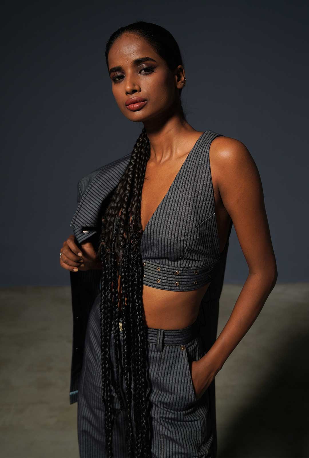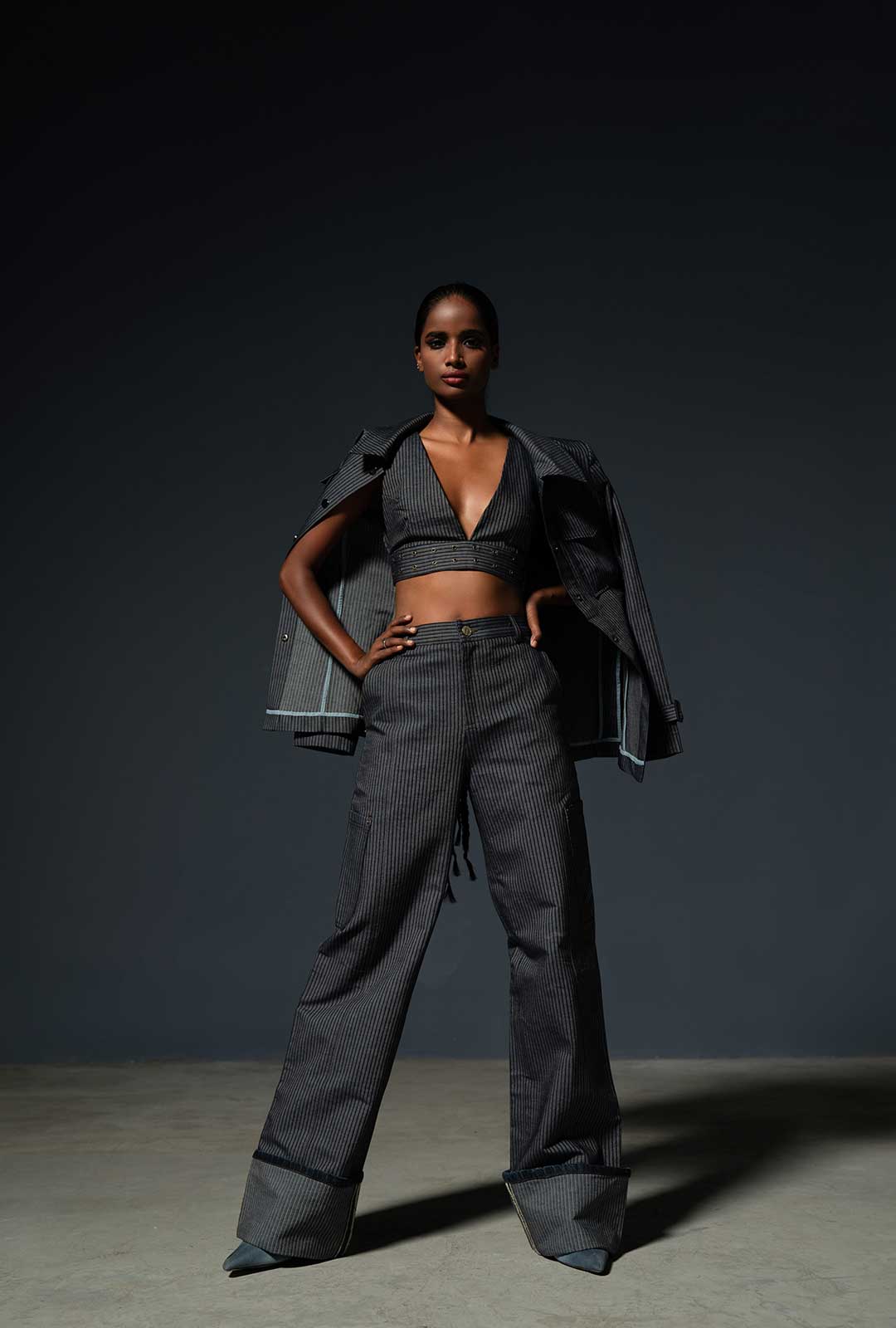 The centrepiece of this ensemble, our Striped Denim V-Neck Bustier, is a bold statement of individuality. Adorned with rivets along the bottom, it adds an edgy flair to your look. The leather lace tie-up detail at the back allows you to personalise the fit, embracing your unique style.