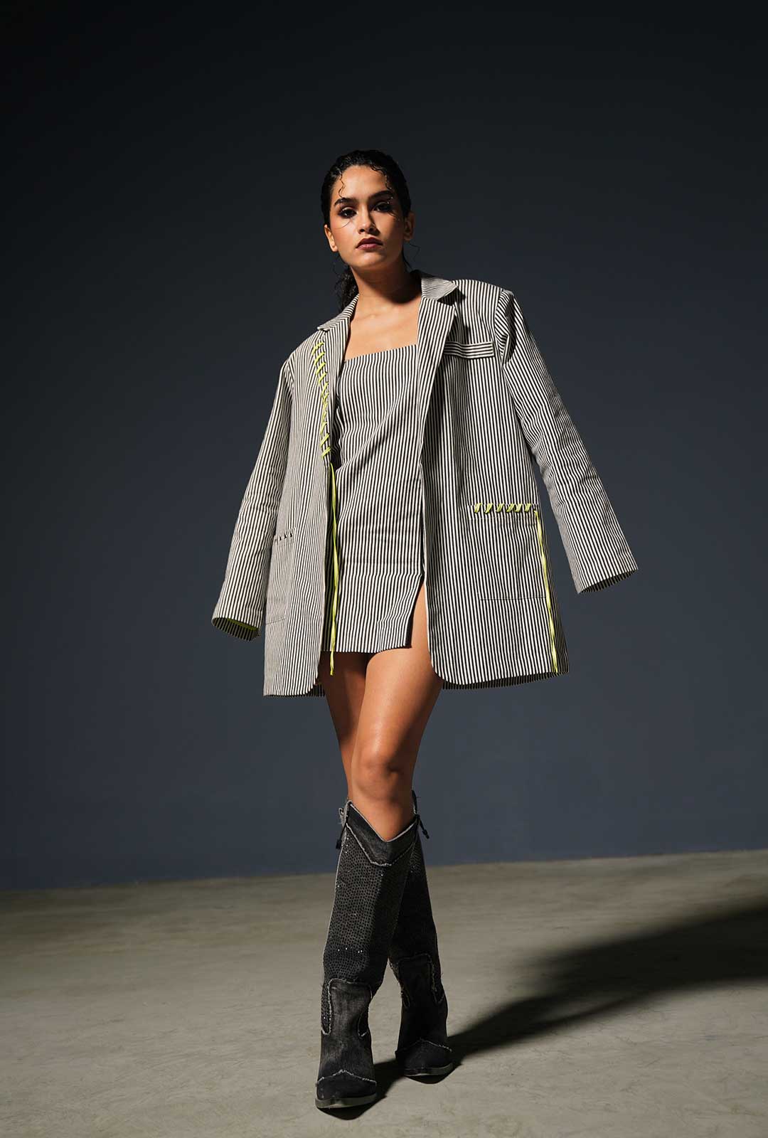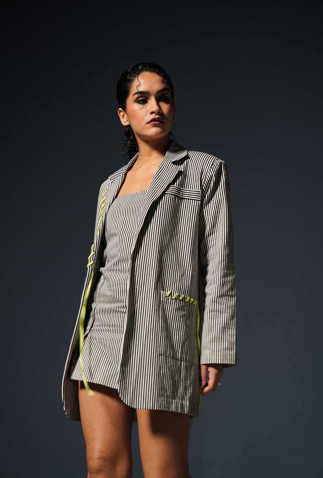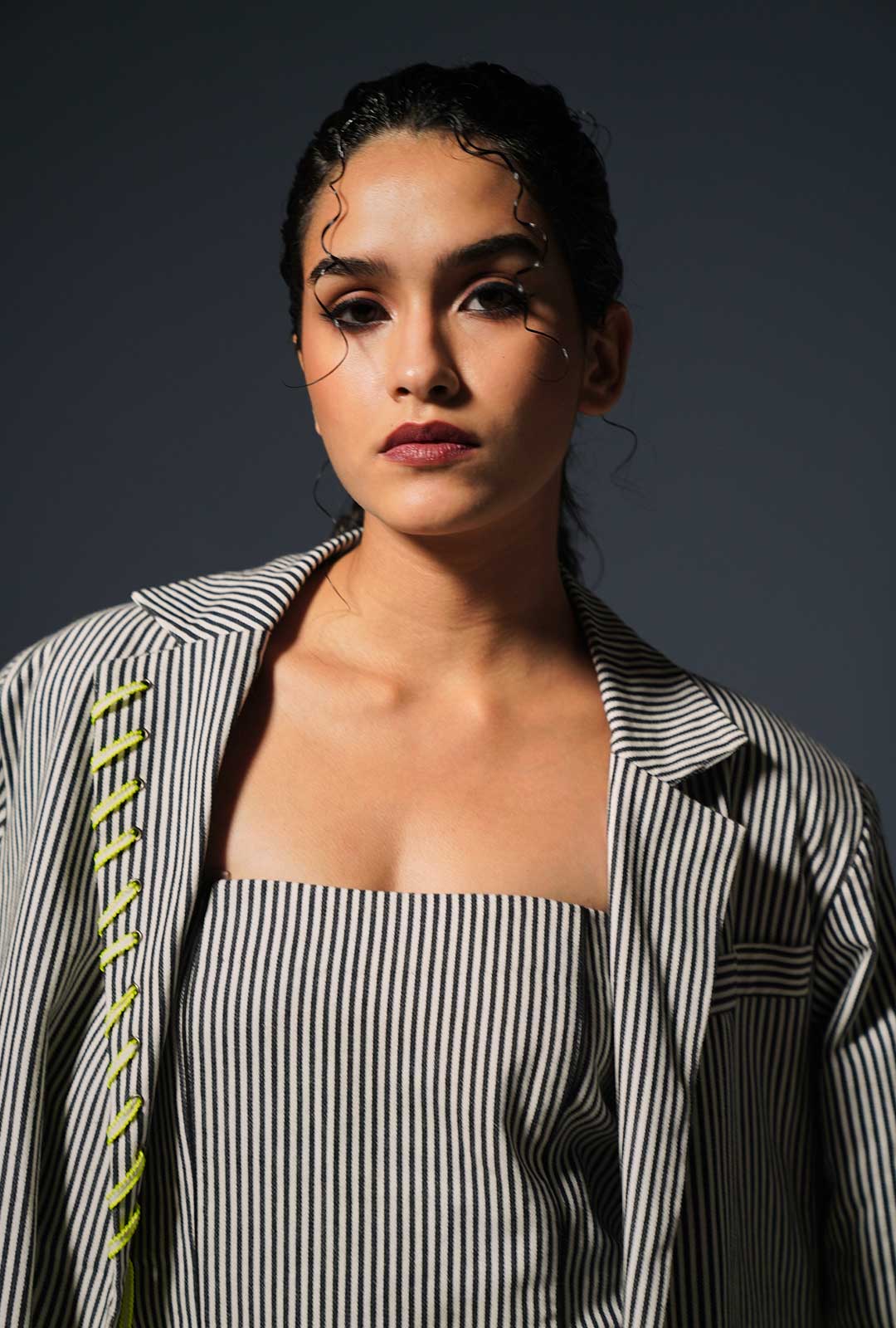 One of the standout features of the blazer is the metal rivet eyelets on one side of the lapel and one of the side pockets. These eyelets are paired with neon green lace, creating a striking contrast that adds a pop of color and a touch of edginess to the ensemble. The inside of the blazer is finished with the same neon green lace, offering a surprising and delightful hidden detail that sets this blazer apart.