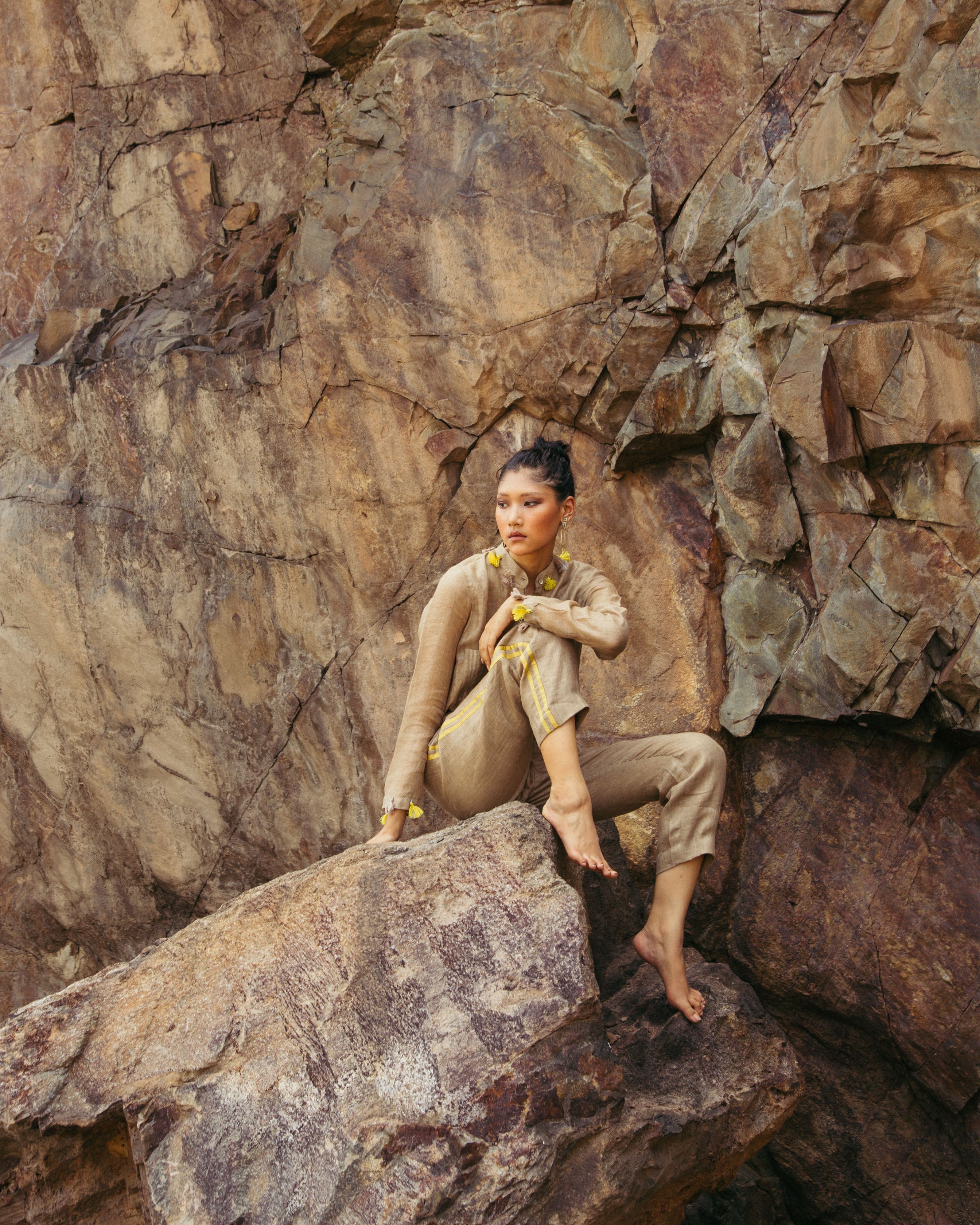 Sand coloured linen jumpsuit with alternate yellow playful tassels on the collar and sleeves breaks the monotony making it casual, comfortable and yet chic.