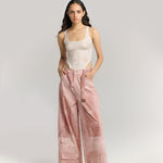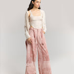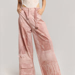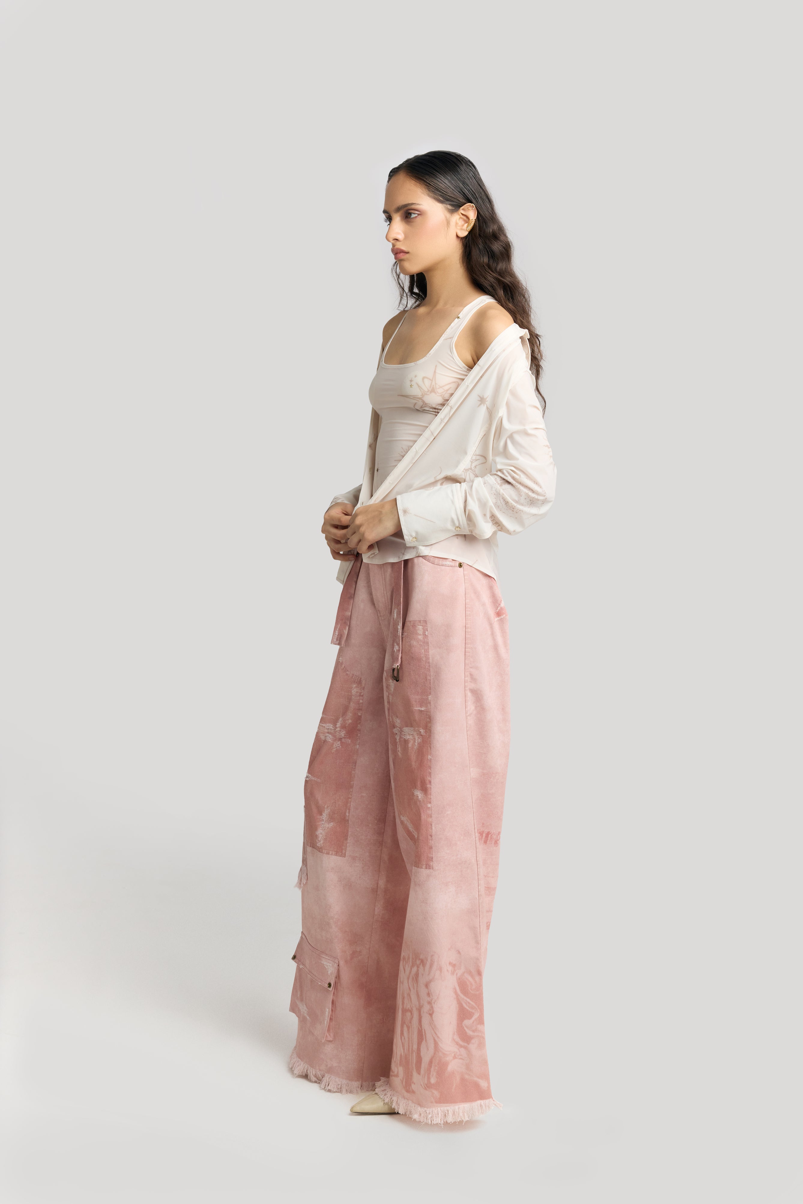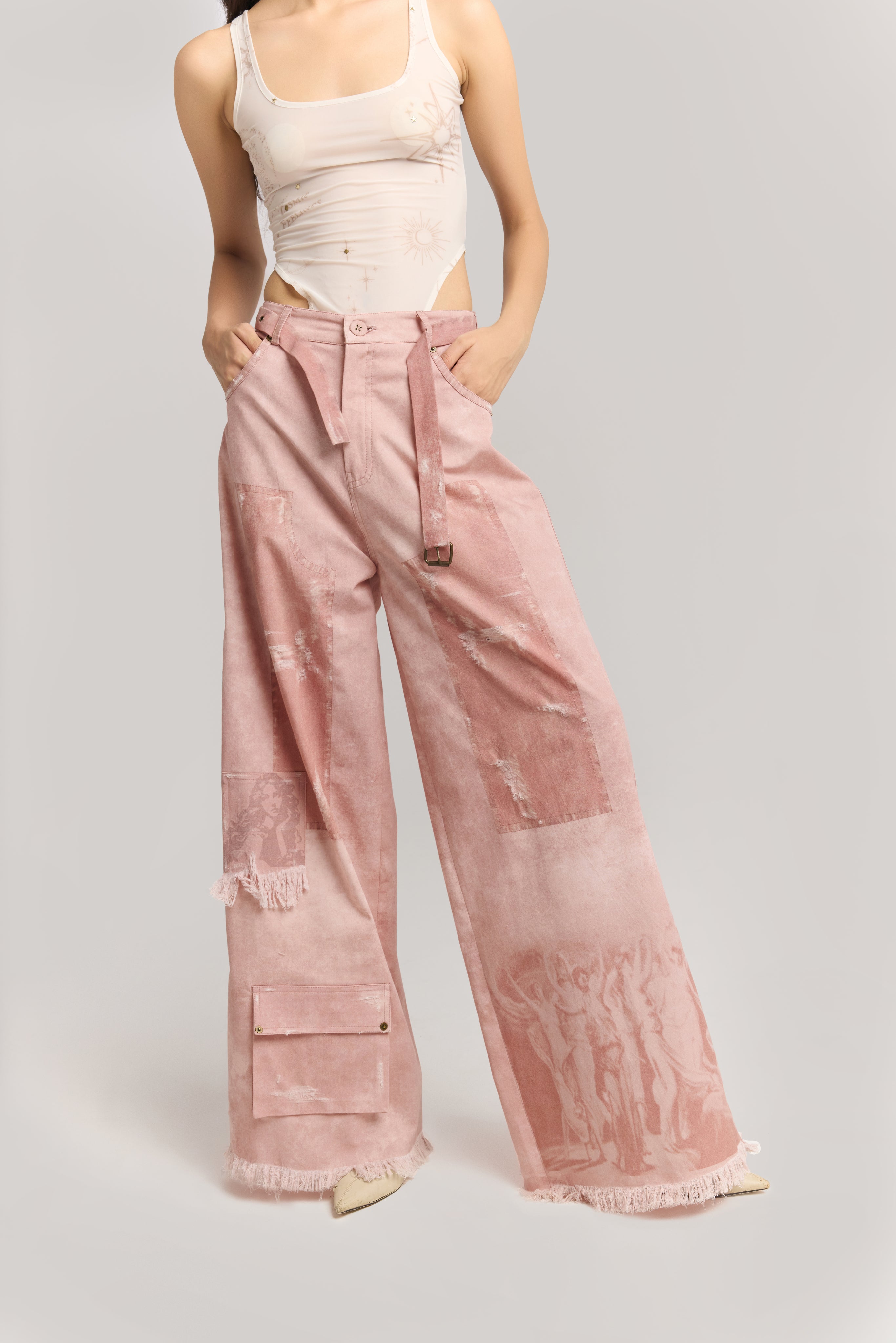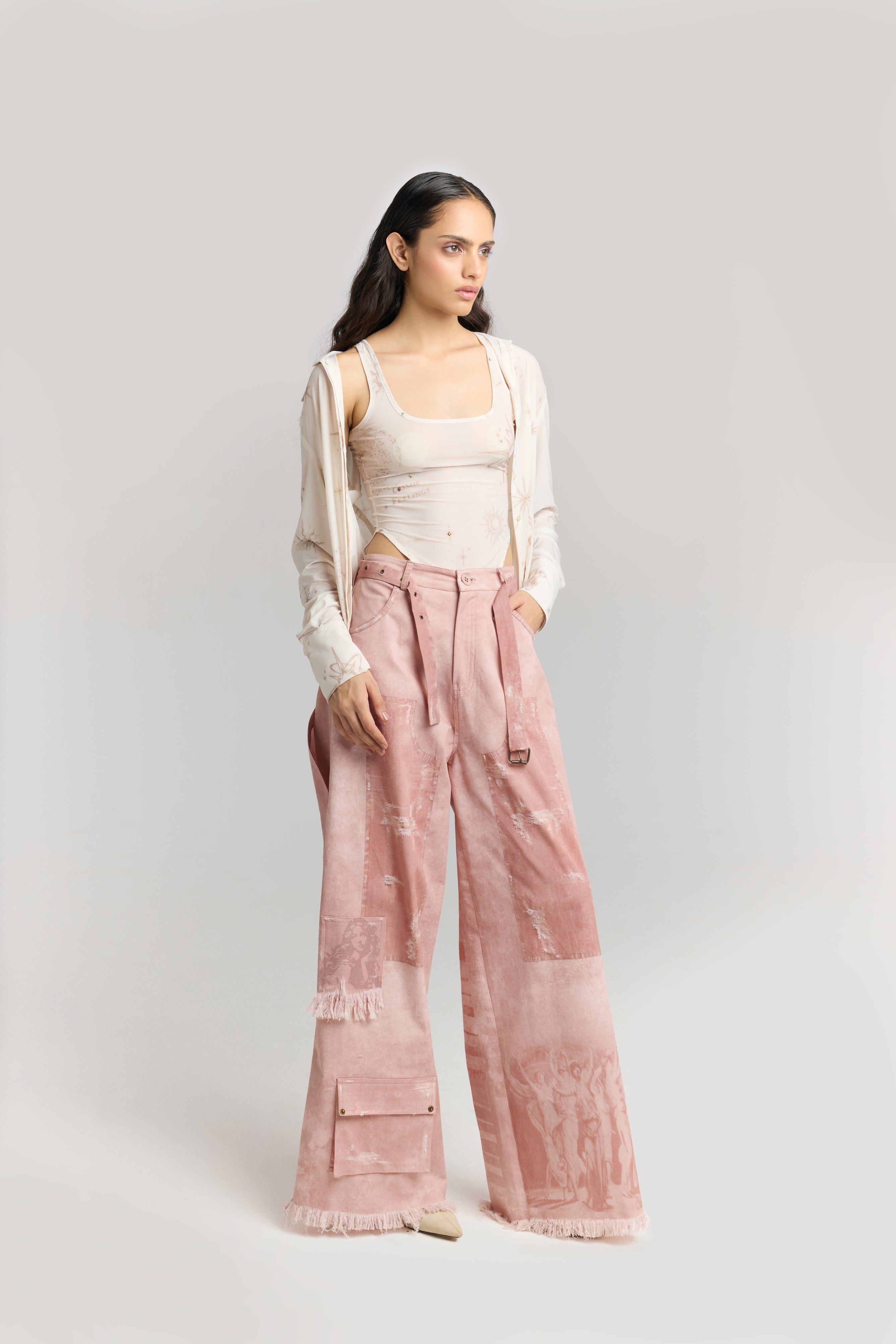Accents - celestial inspired placement prints with printed patch and panels, frayed edges for depth and texture. Features 6 functional pockets and a hanging belt.