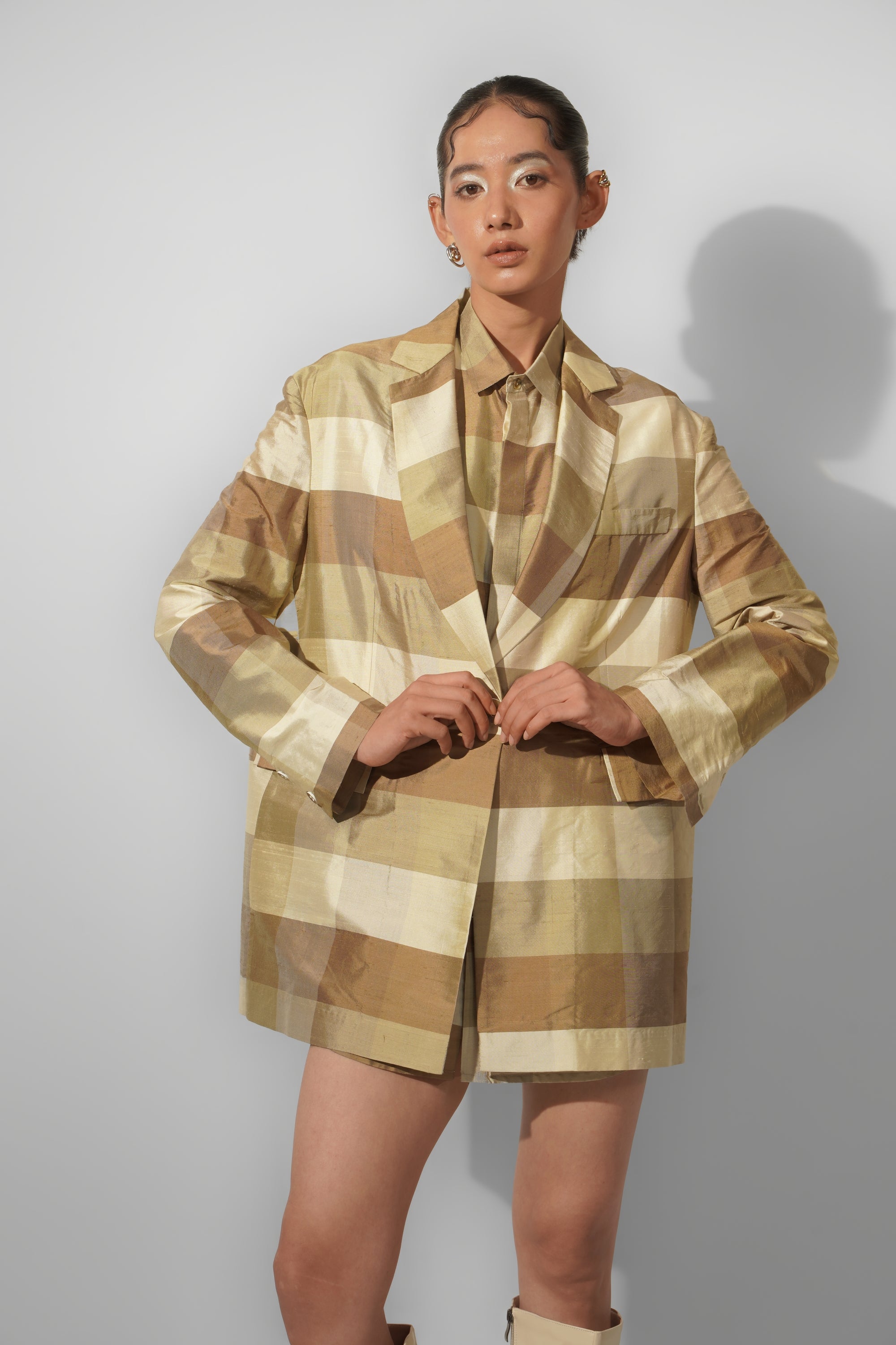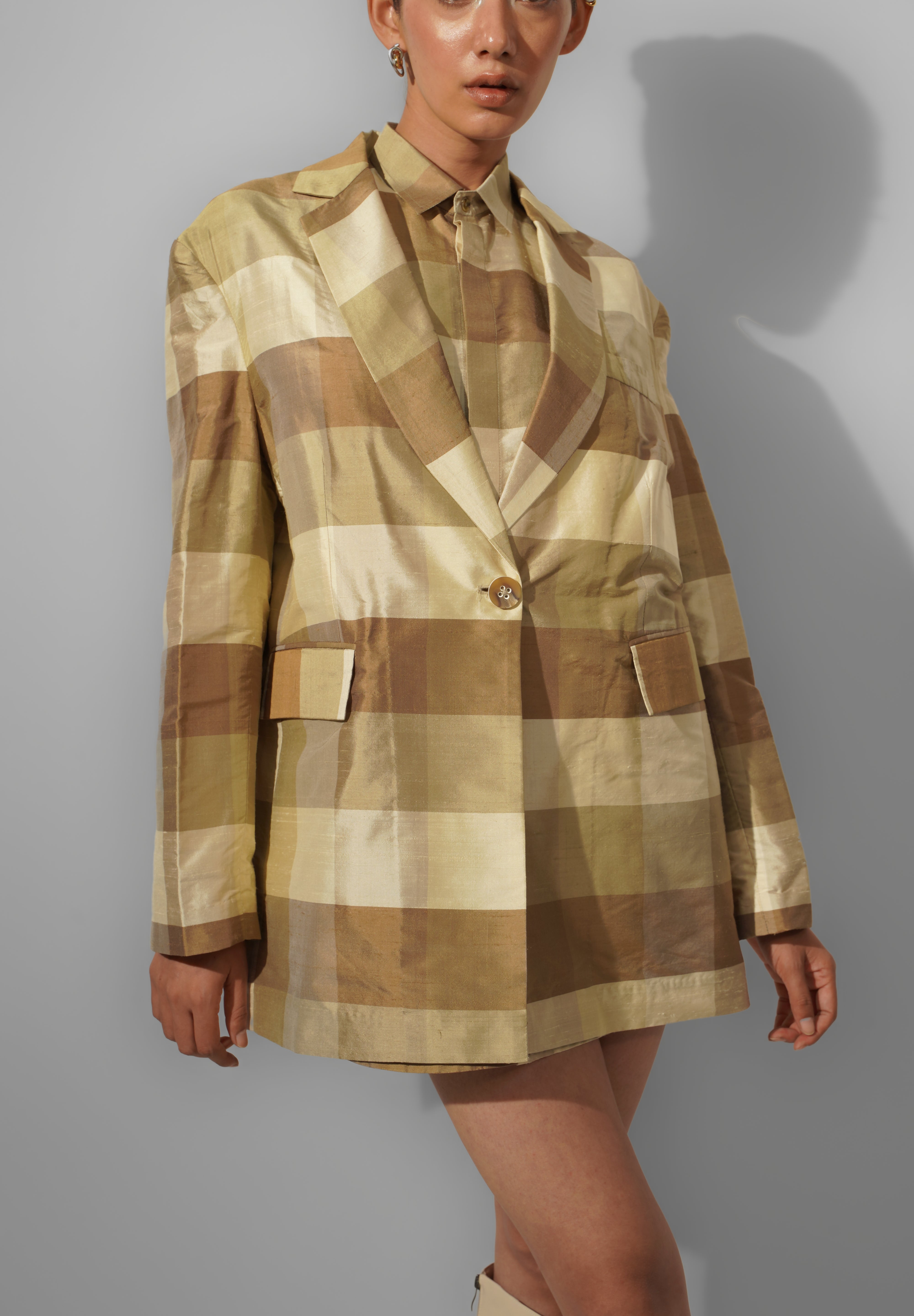 Accents - Crafted in raw silk, this blazer and shirt dress set highlights tonal checks, detailed with clean hems, minimal stitching, a classic notched lapel, and front flap pockets for a refined silhouette.