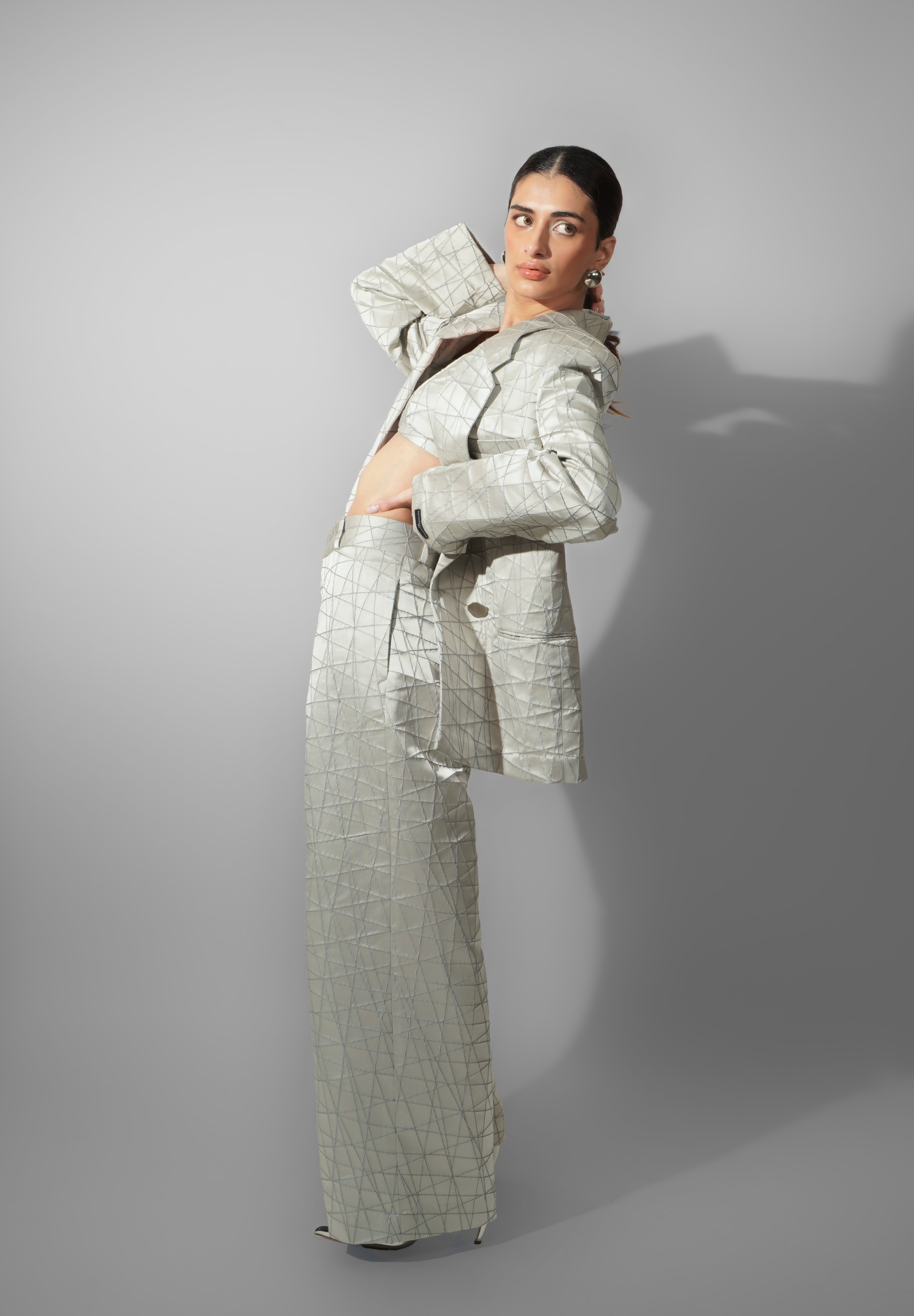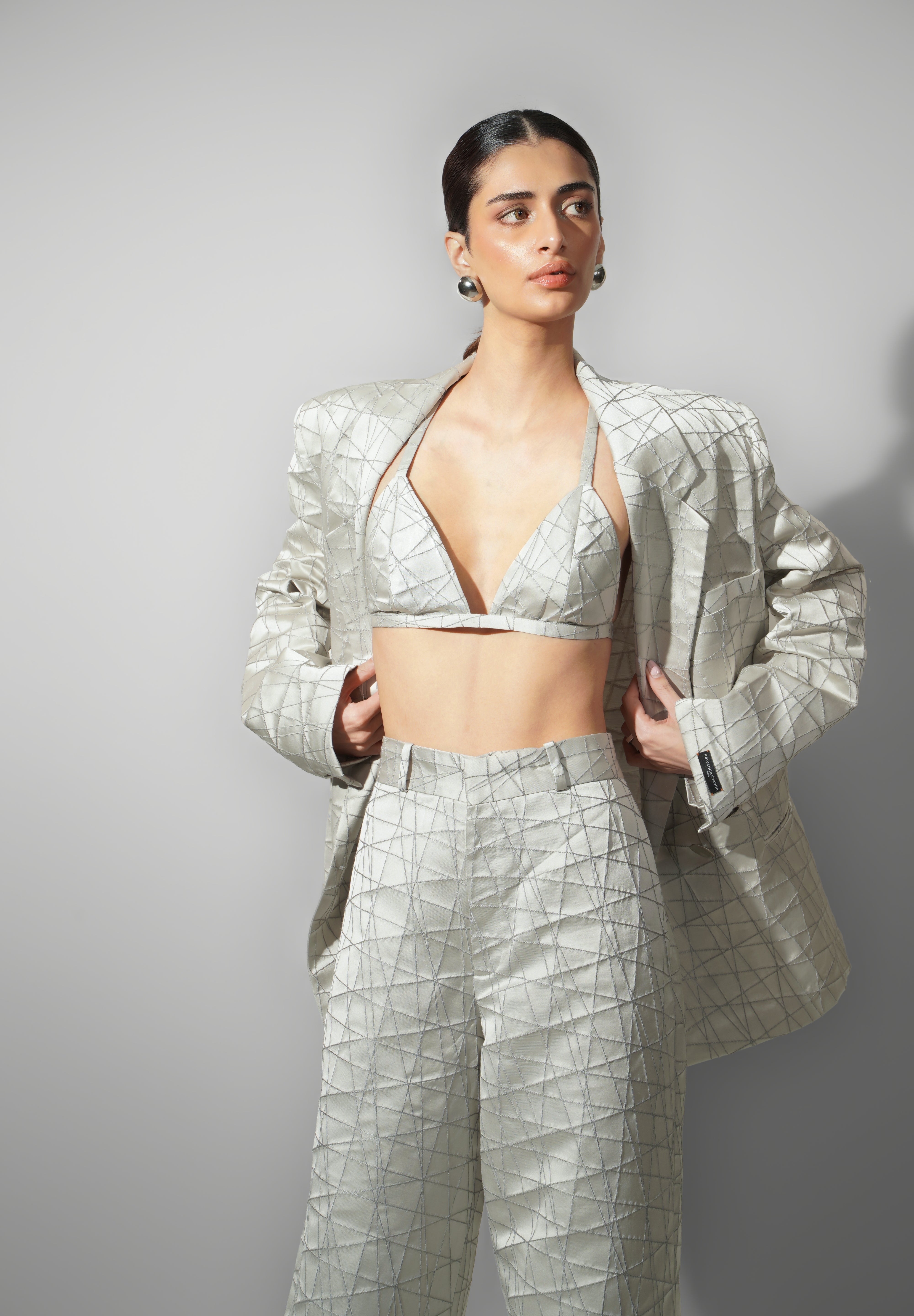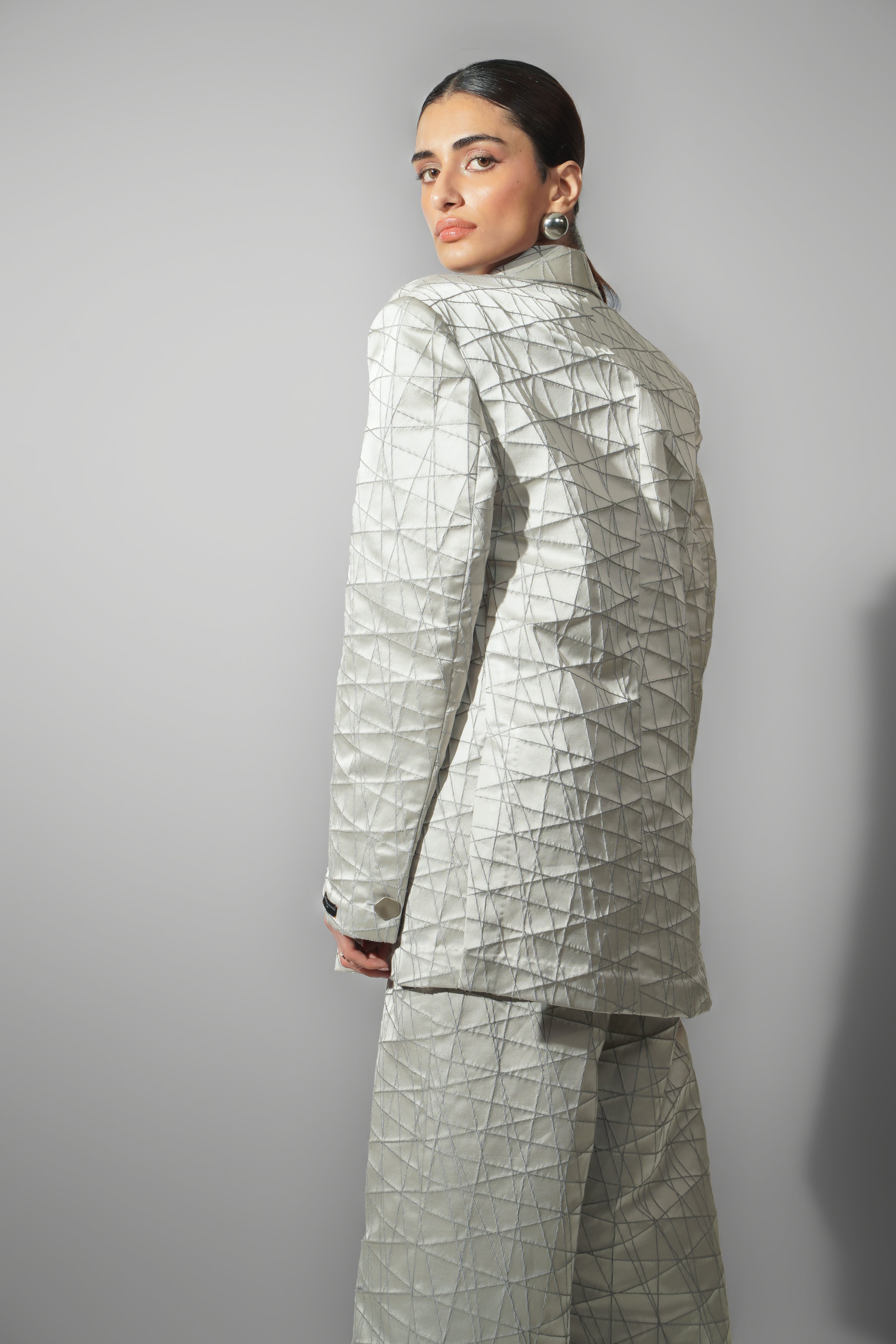 Accents – Geometric pattern embroidery across all pieces add depth and dimension; blazer designed with sharp shoulders and statement lapels.