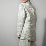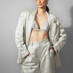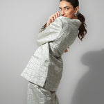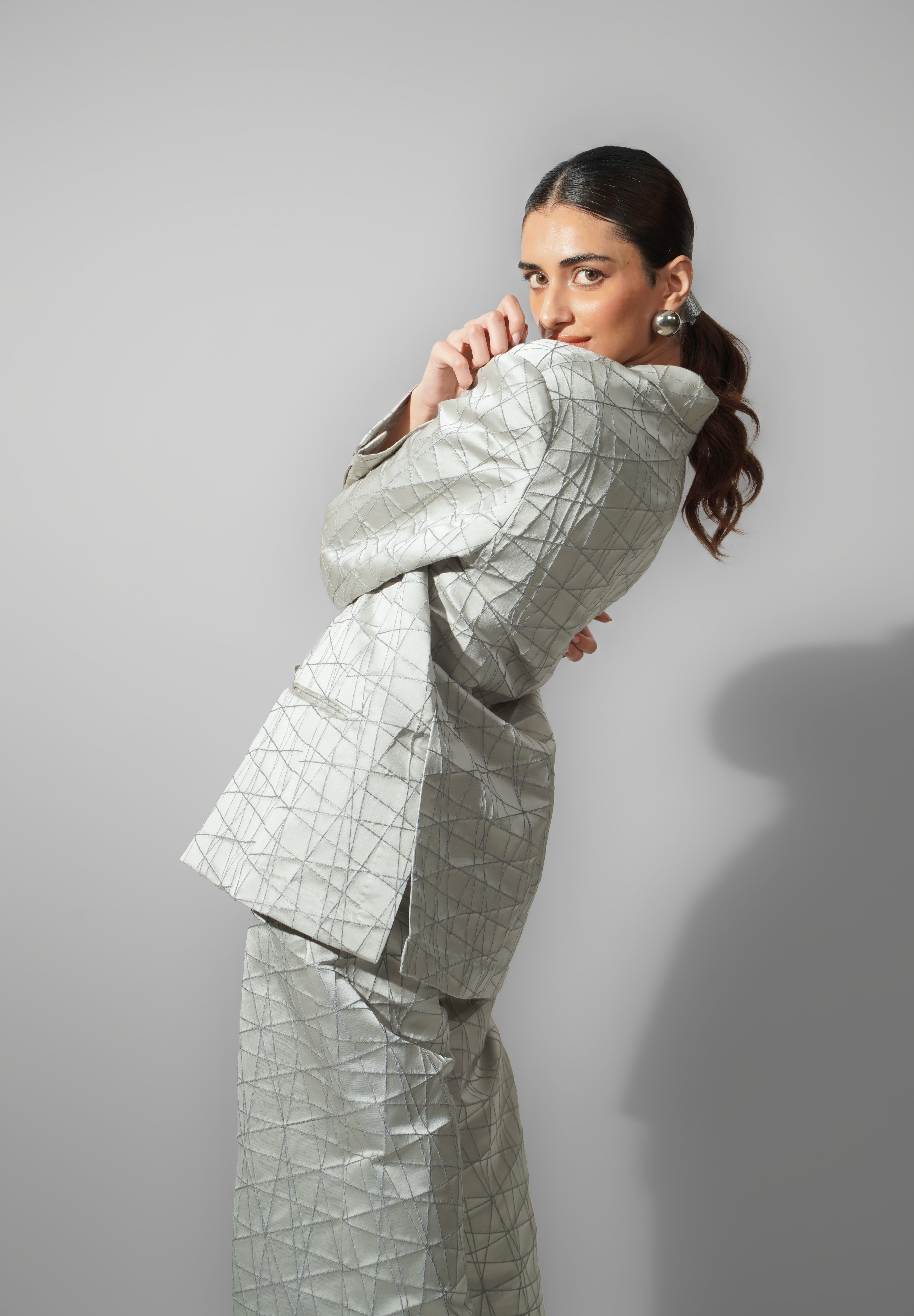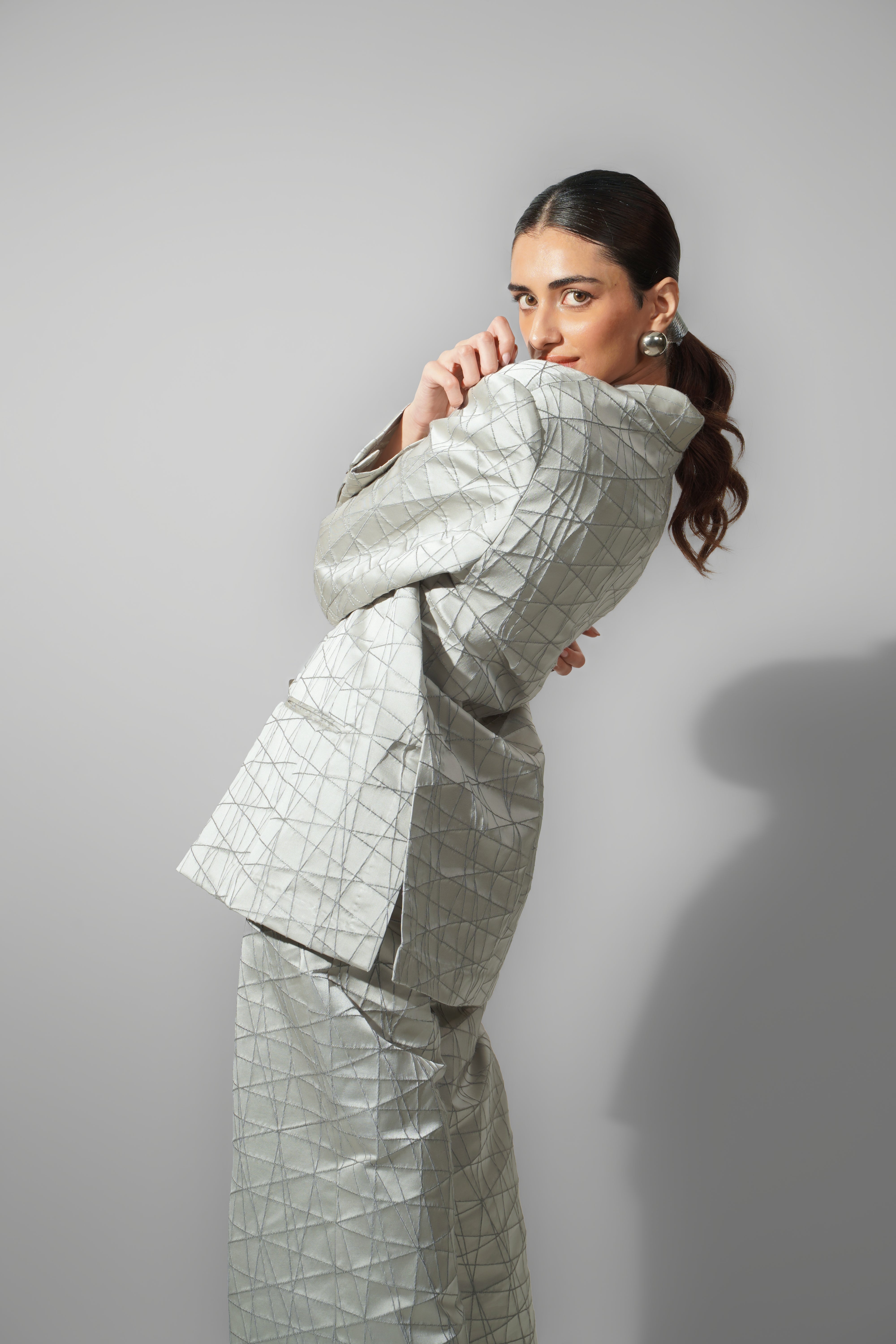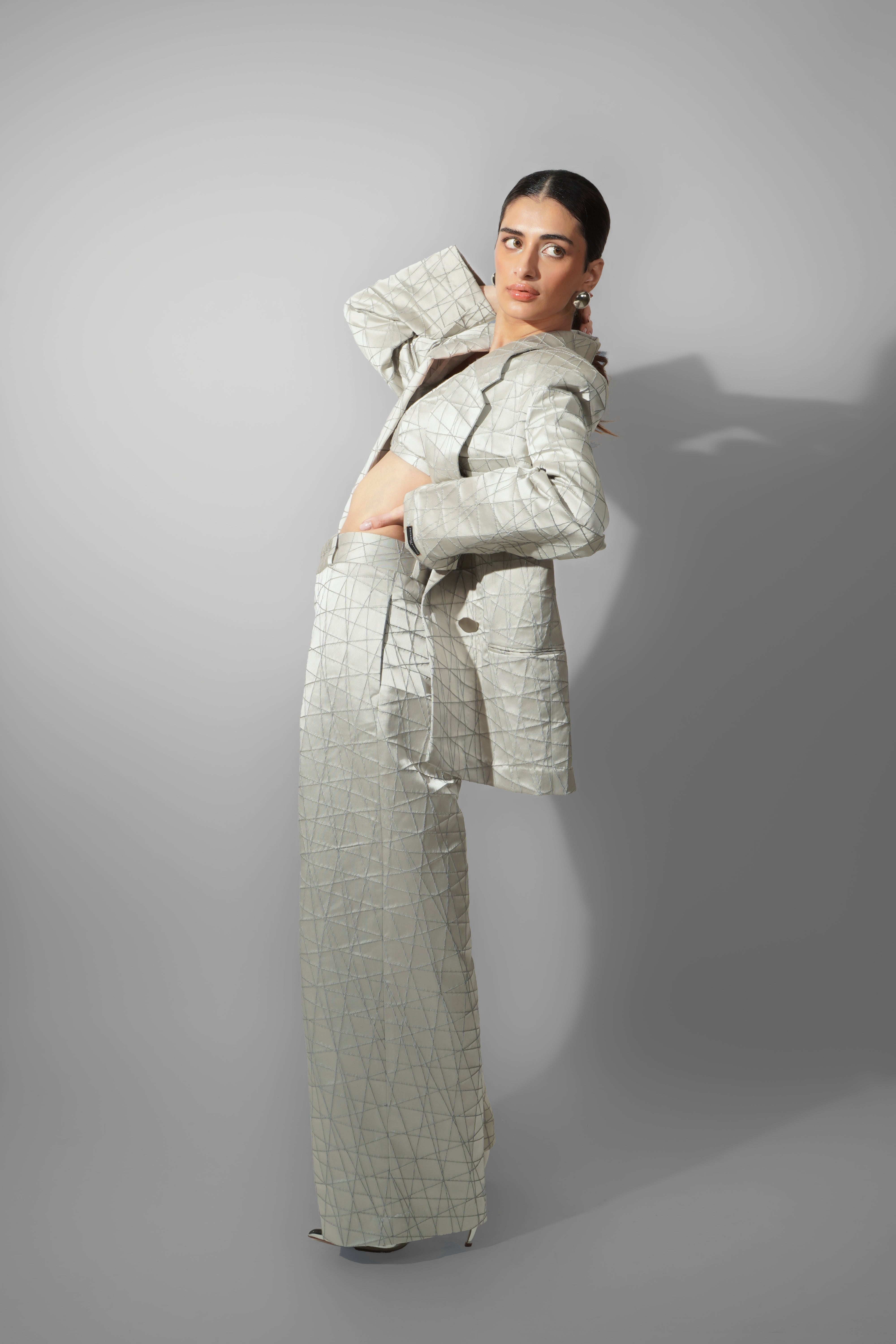 Accents – Geometric pattern embroidery across all pieces add depth and dimension; blazer designed with sharp shoulders and statement lapels.
