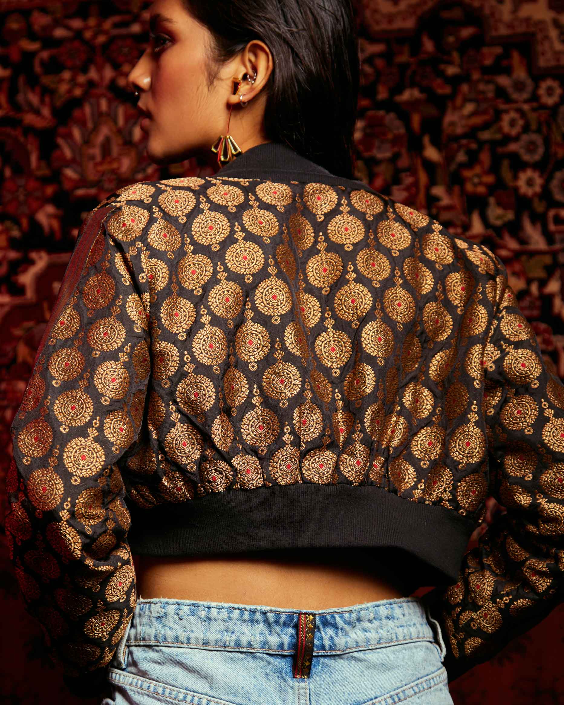 Elevate your going-out wardrobe with this elegant yet edgy cropped bomber jacket engineered from brocade silk. With knitted fabric detailing on its side, cuffs and the collar, bronze motifs on the jacket, and stripe details on the sleeves, this piece stands out in a sea of bomber jackets. It’s perfect for every season – summer, spring, and fall. The cropped cut-off shorts are sold separately but look best with the jacket. They have been made more unique by adding brocade patches to the back pockets and the belt loops. Style the shorts with a black crop top and a pair of chunky boots to radiate the quintessential edgy-girl vibe.