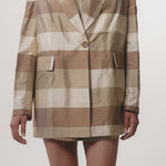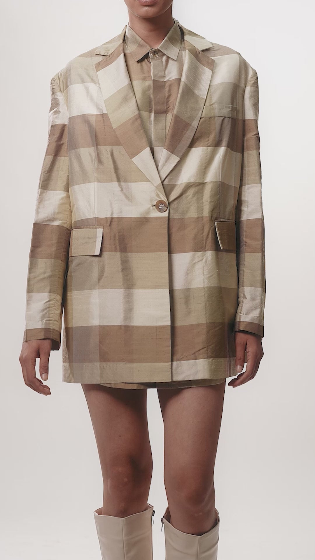 Accents - Crafted in raw silk, this blazer and shirt dress set highlights tonal checks, detailed with clean hems, minimal stitching, a classic notched lapel, and front flap pockets for a refined silhouette.