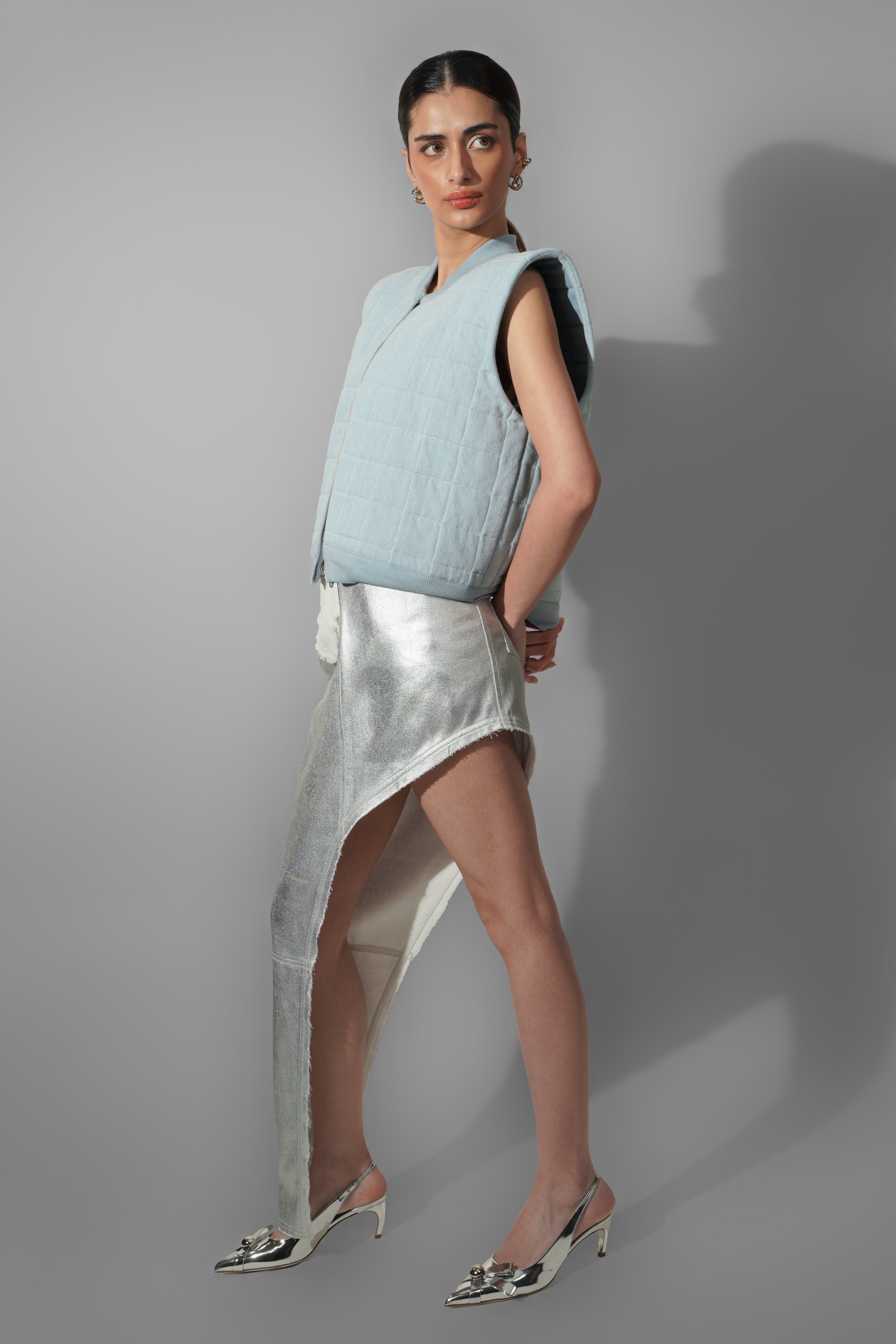 Accents – Silver metallic sheen, with a contrasting waistband and an asymmetric hemline.