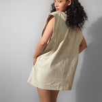 Fit – Relaxed oversized blazer dress layered over a structured, form-fitting corset.
