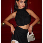 Sleek and sculptural, this black halter top redefines festive eveningwear with its sharp cut and flattering neckline. Tailored in linen with fine pin tucks and subtle embroidered accents, it offers a clean, modern silhouette that feels both minimal and refined. A versatile piece that transitions seamlessly from statement set to standalone hero, it’s designed for the woman who commands attention without trying.