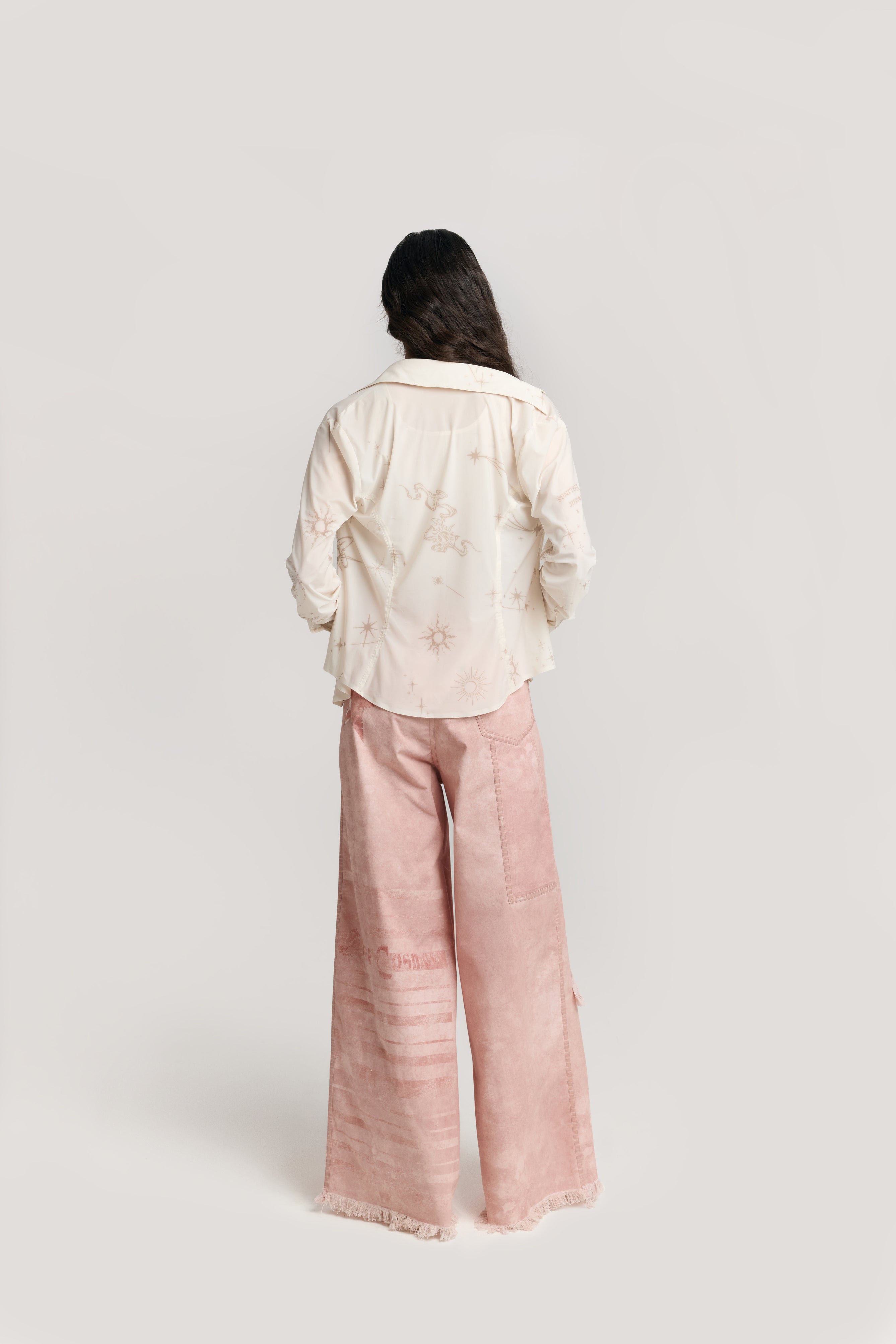 Accents - All over celestial inspired print placements and minimal seams for a smooth finish. Closure - Concealed buttons at the front.