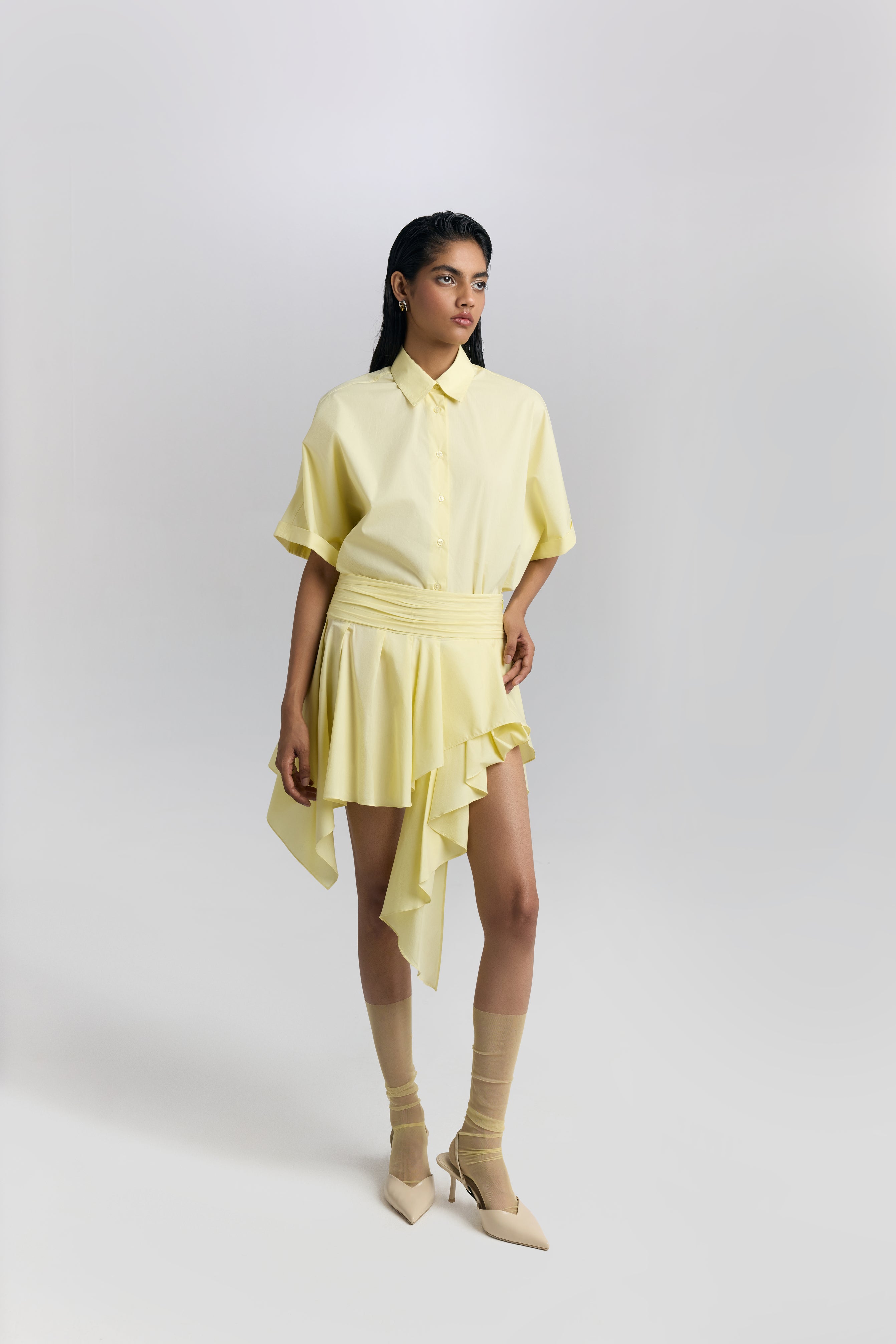Accents - Structured pleated belt at the waist; soft pleats and subtle ruffles layered throughout the skirt for volume and movement.